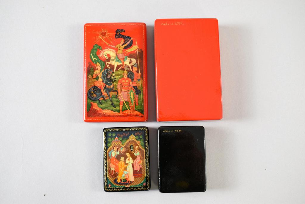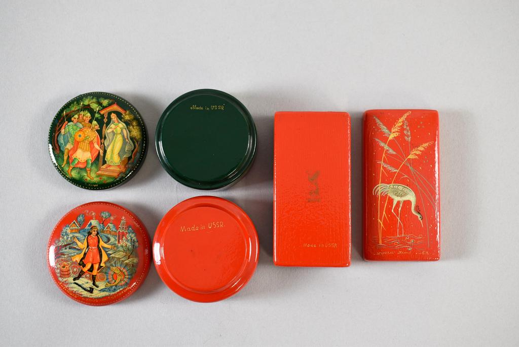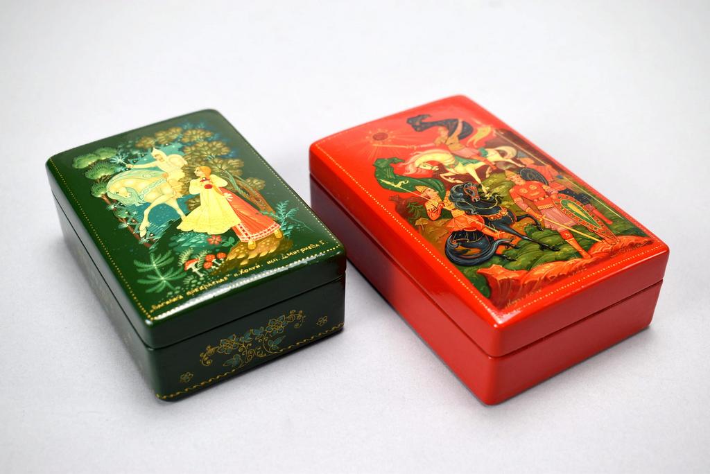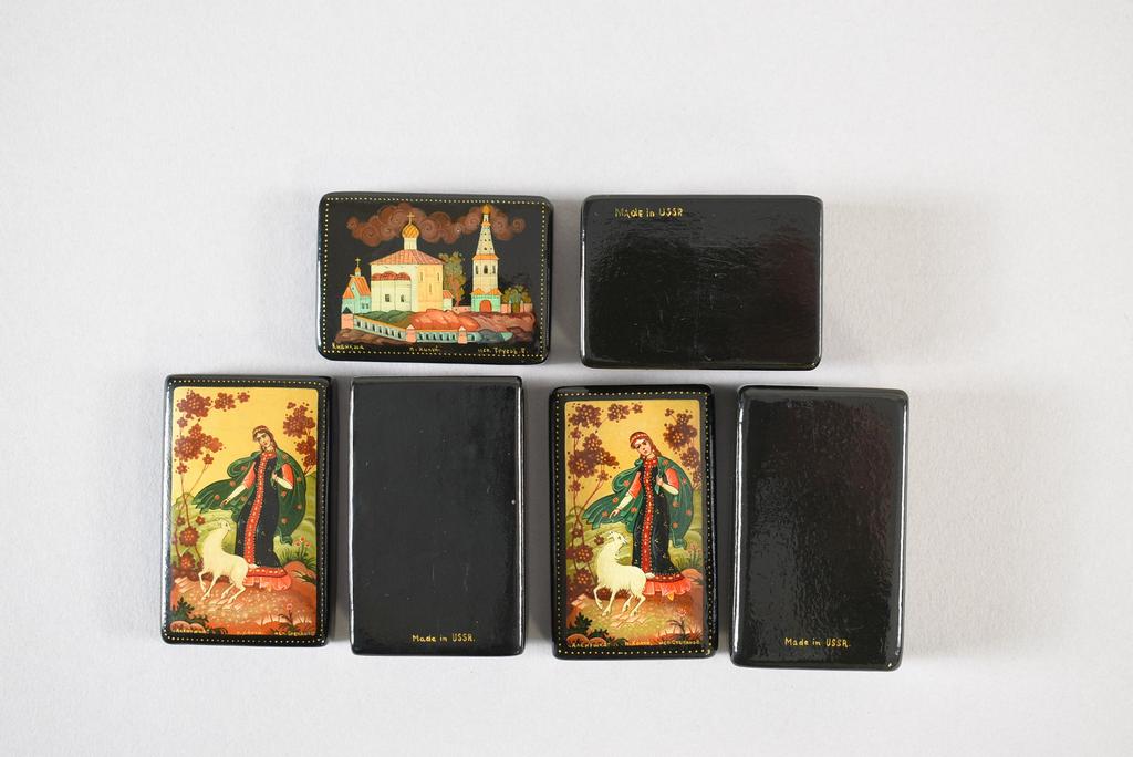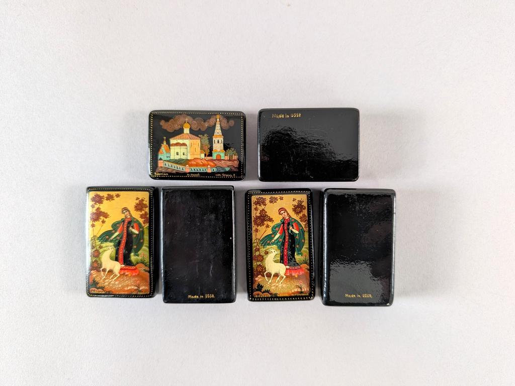 (10) Kholui Russian lacquer boxes depicting various fairy tales. Made in USSR. Largest: 4 1/8" x 2 1/2".