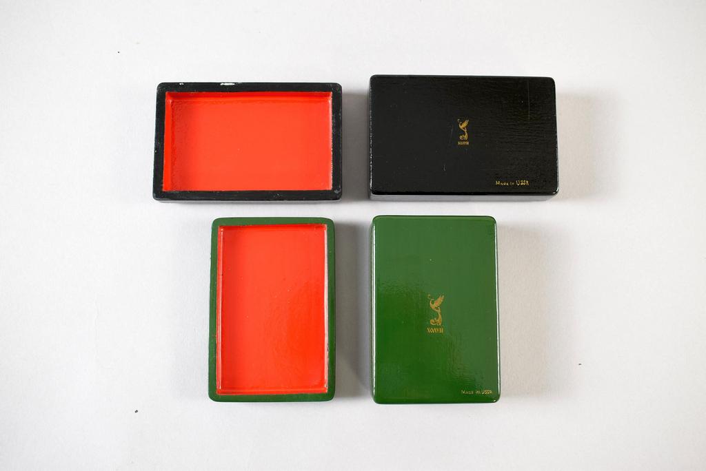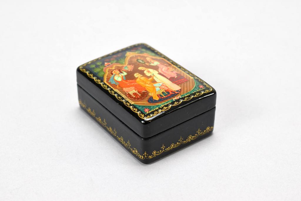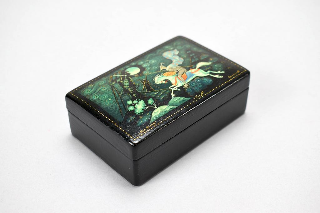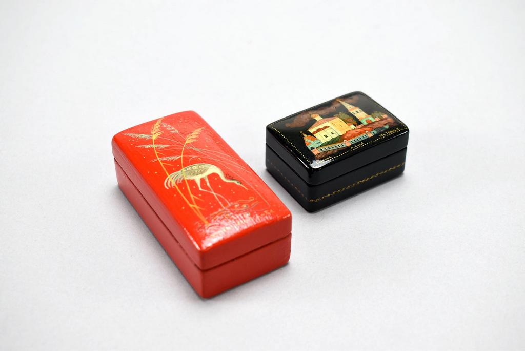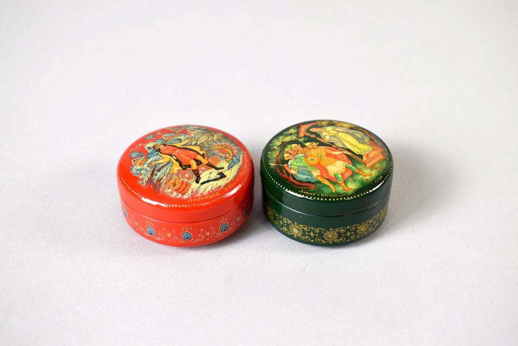 (10) Kholui Russian lacquer boxes depicting various fairy tales. Made in USSR. Largest: 4 1/8" x 2 1/2".