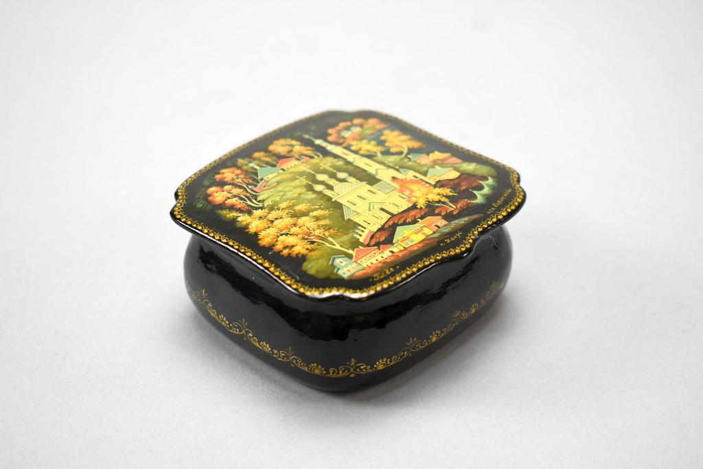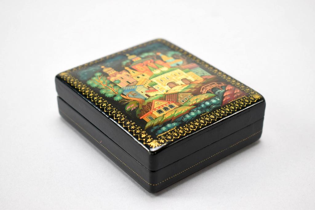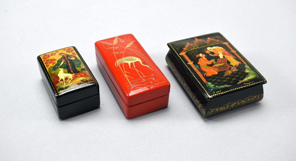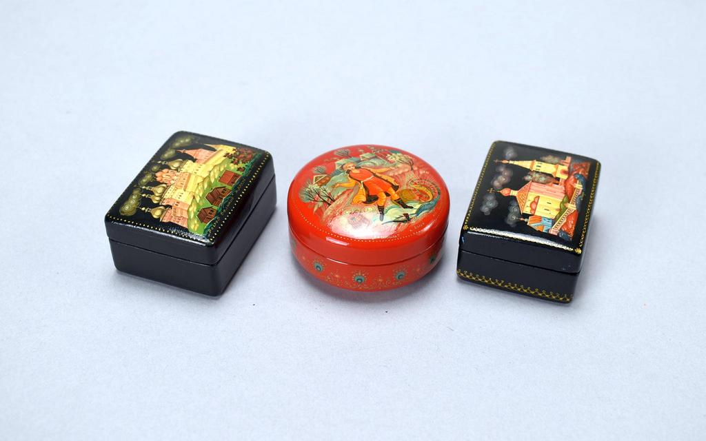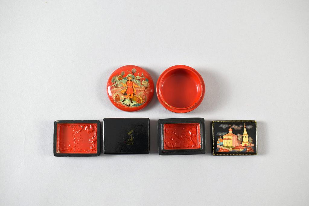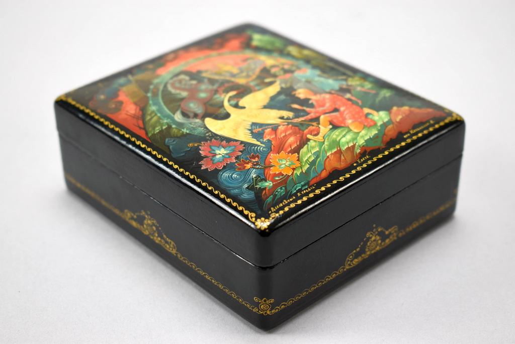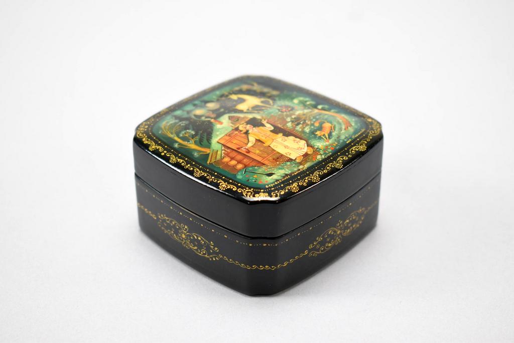 (10) Kholui Russian lacquer boxes depicting various fairy tales. Largest: 4 1/4"x 3 5/8".