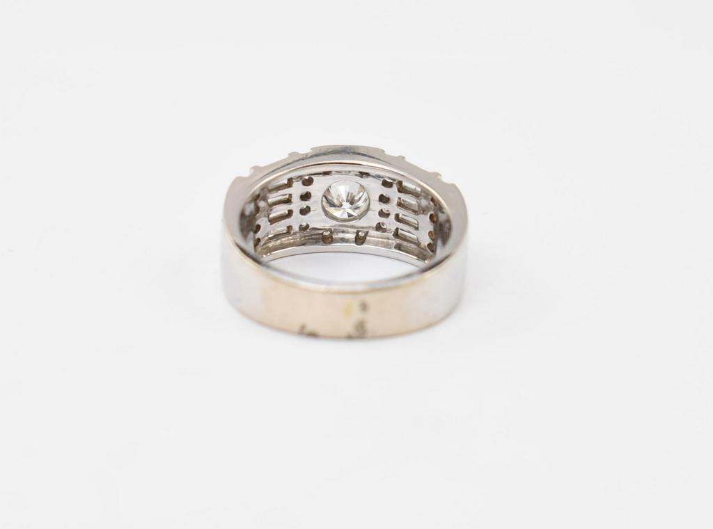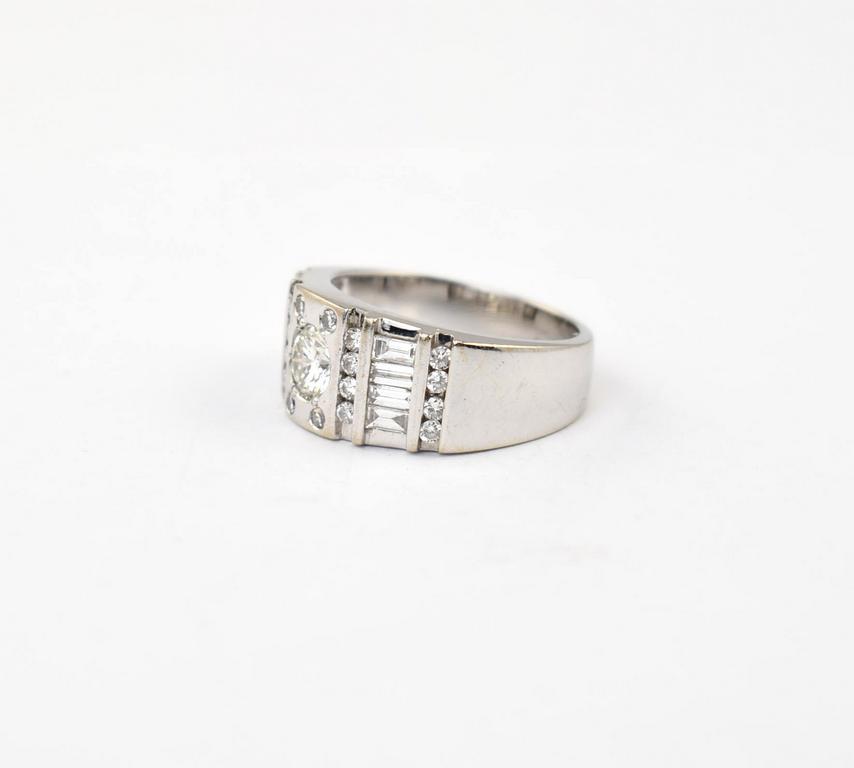 14K White gold and diamond ring. Round brilliant cut center diamond (approx. 0.50 ct estimated) with 28 round and baguette cut accent diamonds. 10 grams total, size 8.5.