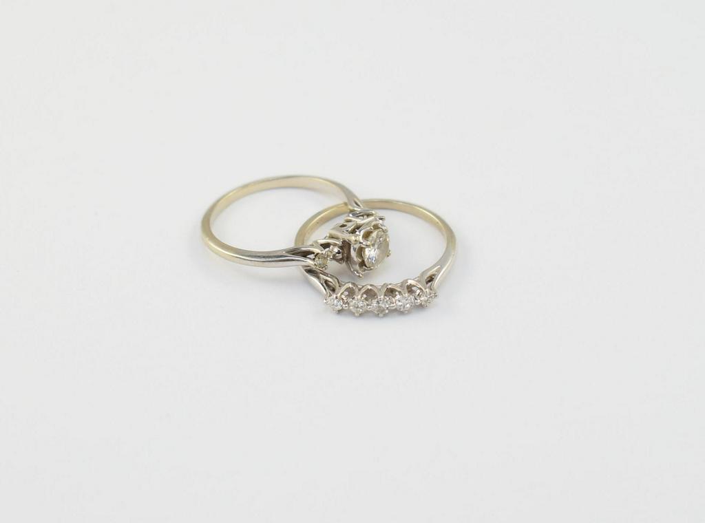 14K White gold and diamond wedding ring set. Diamond ring with round brilliant cut center diamond (0.50 ct estimated) and band with 5 accent diamonds. 3.2 grams, size 6.