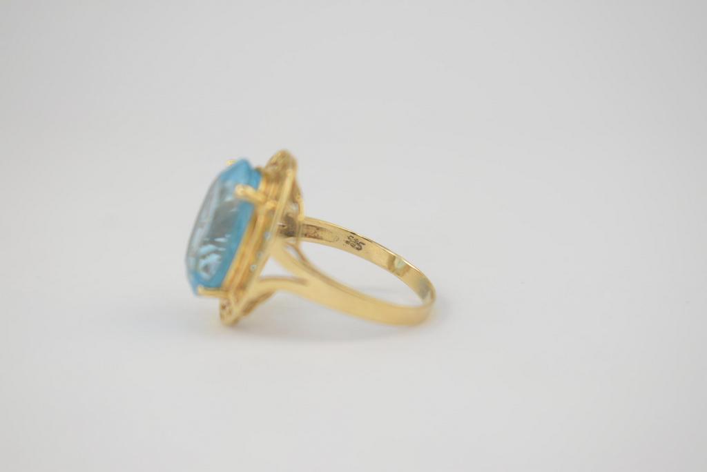 14K Yellow Gold ring set with faceted oval blue topaz. Marked 14K. 5.8 grams, size 9. Topaz: approx. 15 x 12 mm.