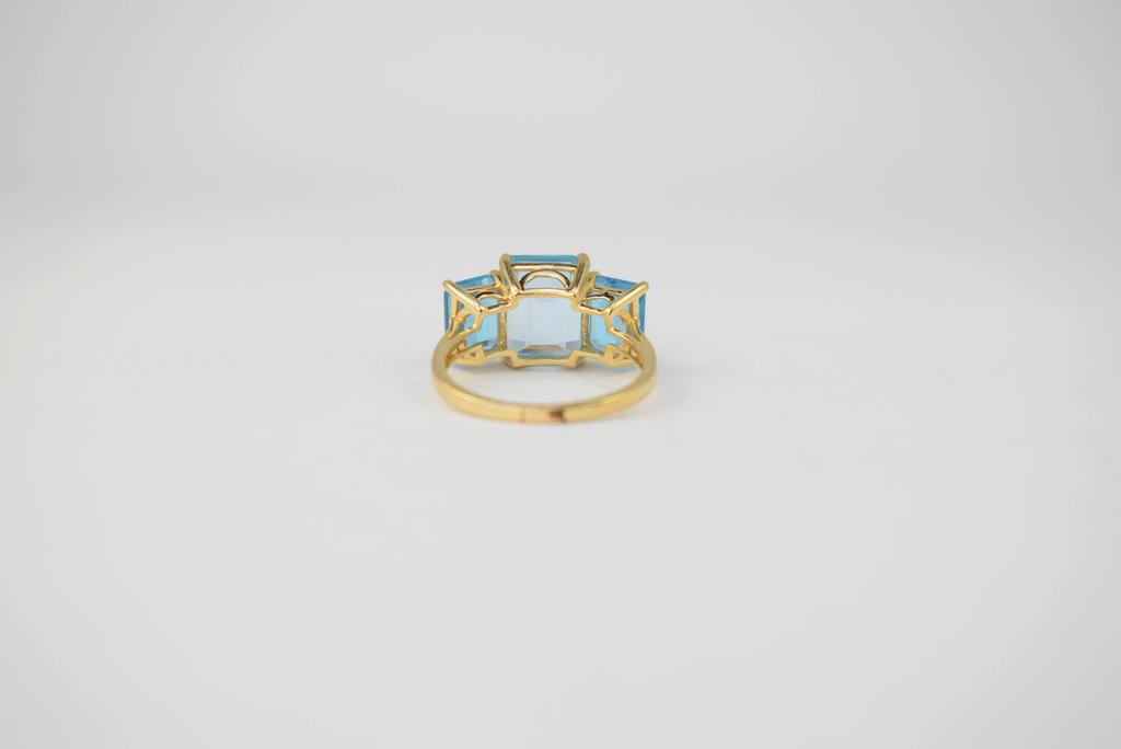 14K Yellow gold ring set with 3 faceted blue topaz stones. Center stone: approx. 11 x 9 mm. 4.7 grams total.