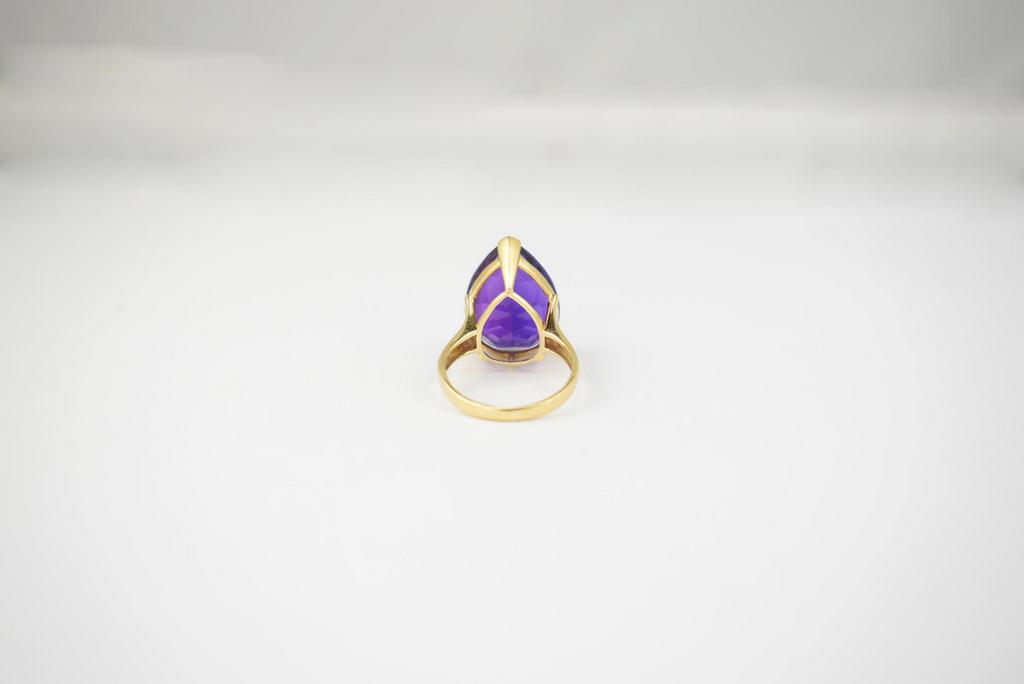 14K Yellow gold ring set with tear drop faceted amethyst. Marked 585. Amethyst: approx. 20 x 15 mm. 6.9 grams total.