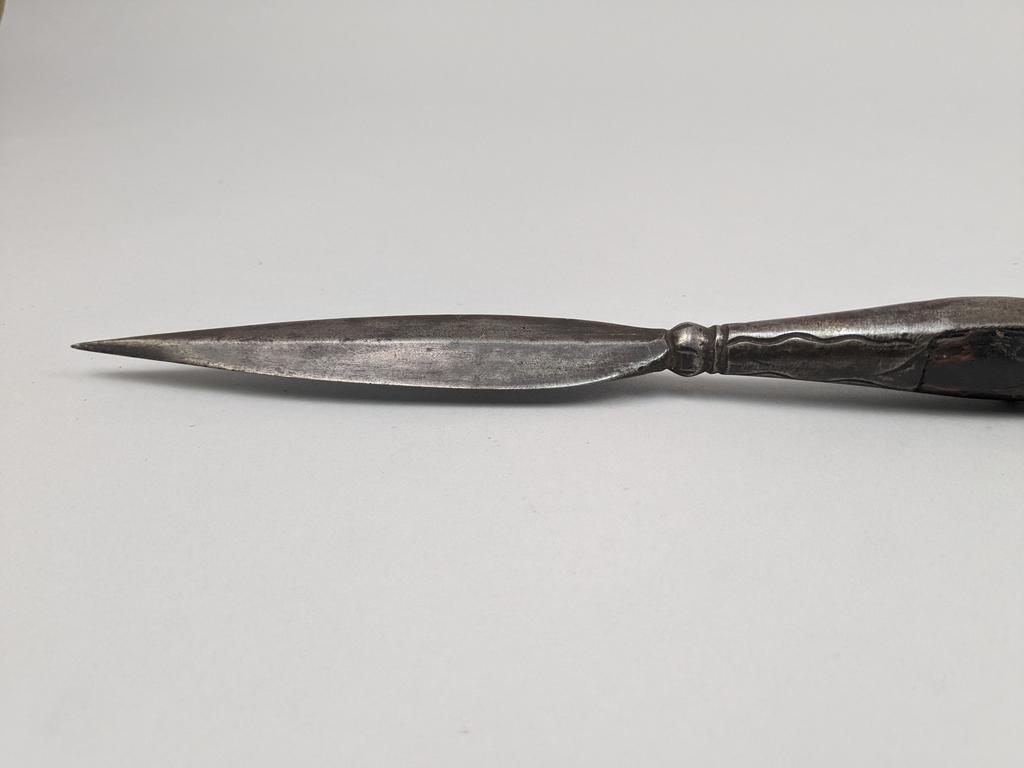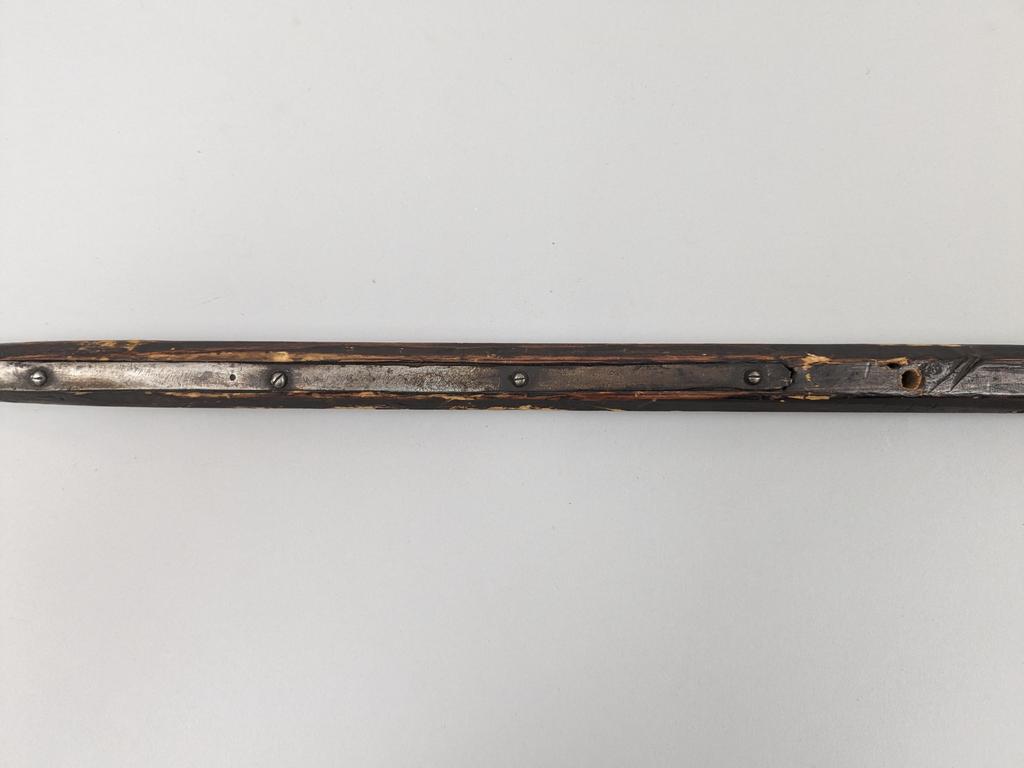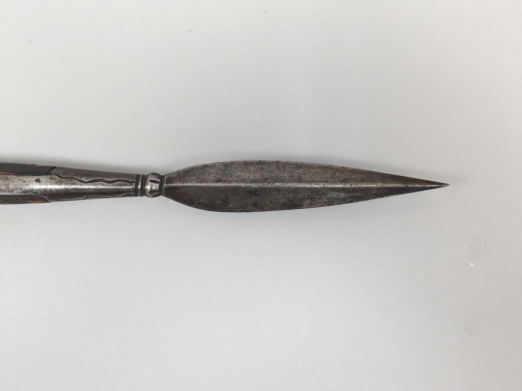 17th / 18th C. European Pike. Leaf form 6 inch blade with diamond cross section above a notched ball, 2 inch socket with incised wavy lines and 12 inch mounting straps. Mounted on 41 inch shaft which is broken on one end.