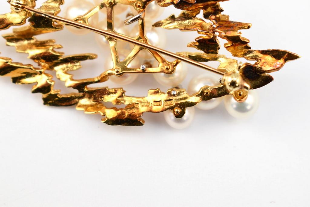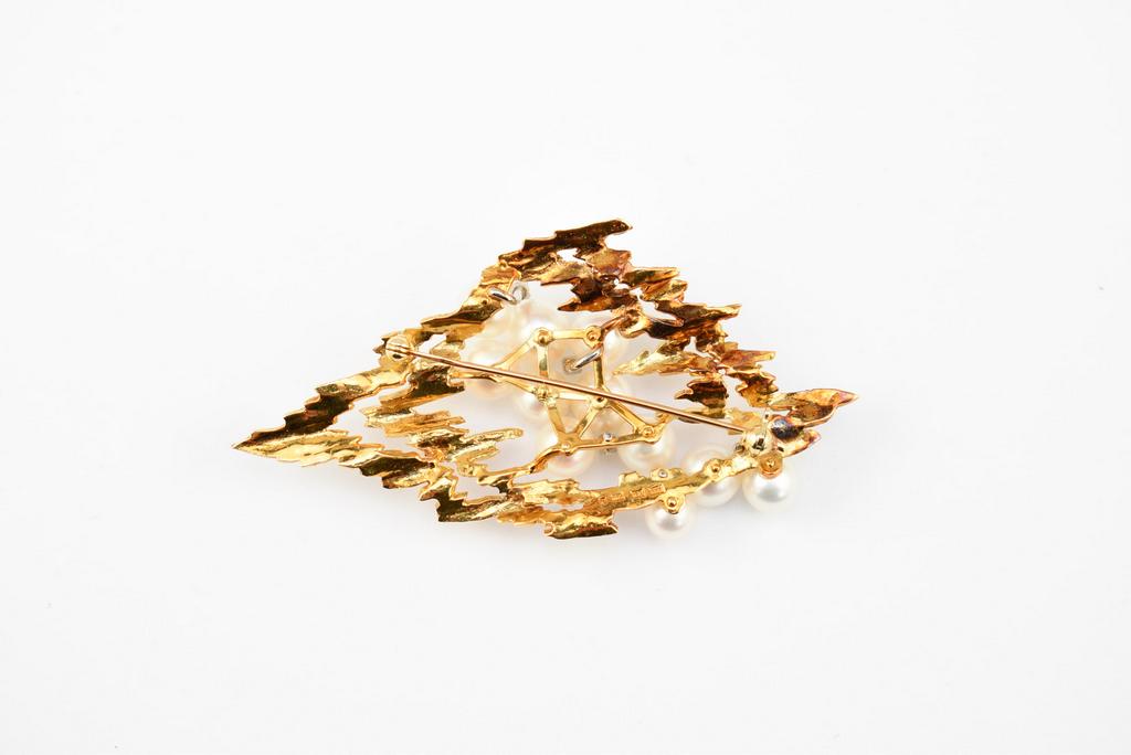 Yellow gold free form brooch with 11 Mikimoto pearls and 5 accent diamonds in white gold mounts. Marked K18 WG K14. 2 3/4" x 1 1/2". Brooch tests 18K. 23.6 grams total.