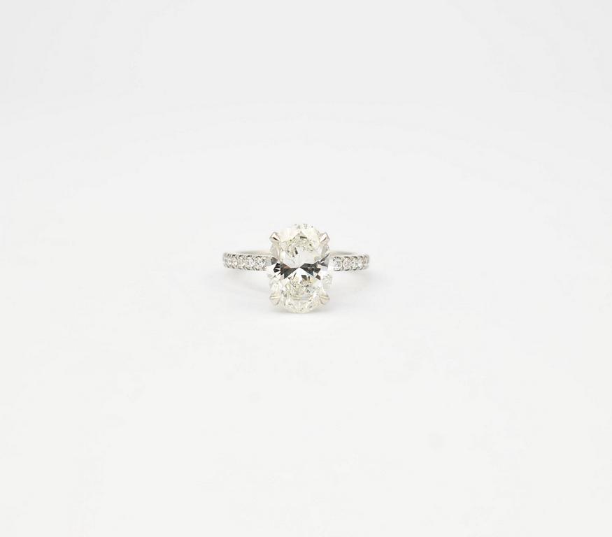 18K White Gold & Diamond engagement ring. Oval brilliant cut diamond (GIA No. 2287953066, 10.86 x 8.07 x 5.13 mm, 2.80 ct, Color: I, Clarity: VS2), surrounded by 12 accent diamonds on each side, set in white gold ring marked 18K. 3.1 grams total, size 5.