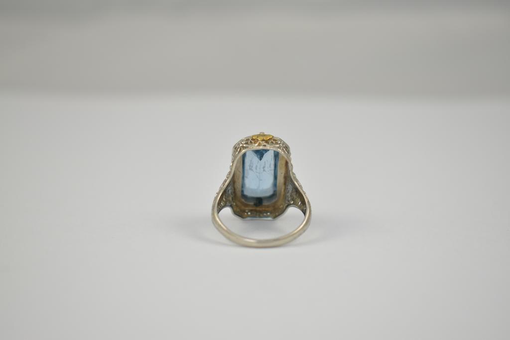 18K White gold ring with faceted blue stone and yellow gold accents. 6 grams total. Marked 18K, size 7. (Stone: approx. 16.5 x 10 mm).