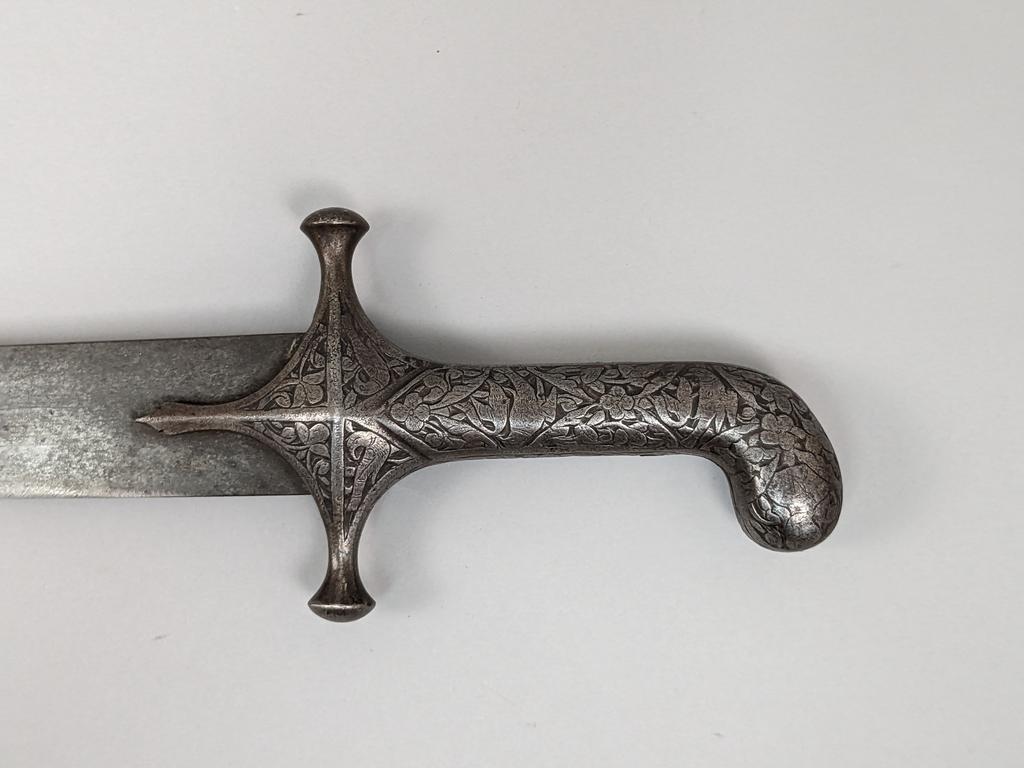 18th / 19th C. Persian Shamshir. Engraved handle with raptors and foliage, cruciform hilt and downward turned pommel. Long curved blade continuous fuller along mid blade and staggered fuller along top interspersed with gilt metal inlay and gilt metal inlaid cartouche.