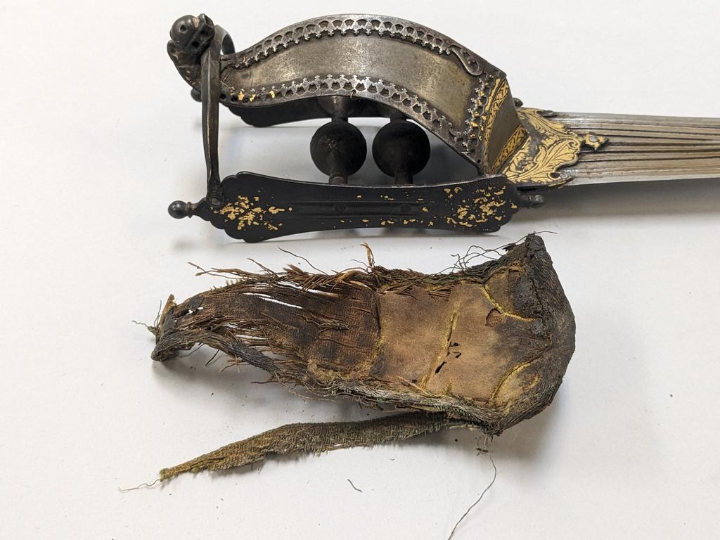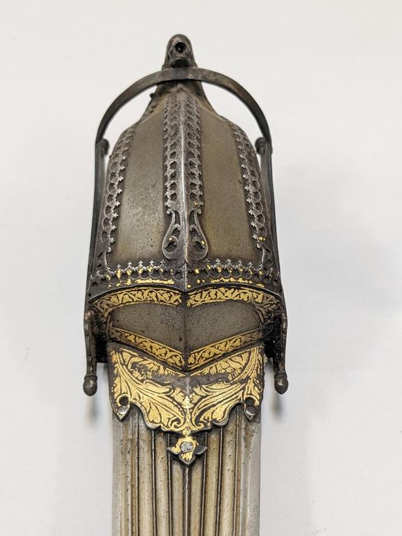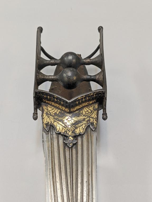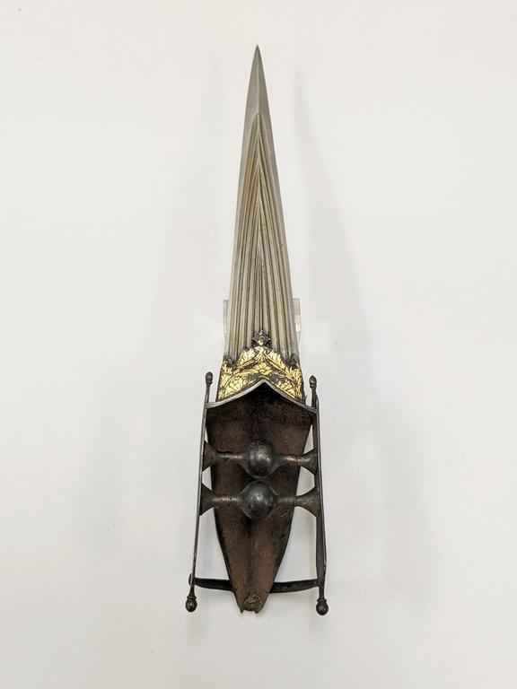 18th C. Indo-Persian Hooded Katar Dagger. Steel with gilt embellishments and fullered triangular blade. Original hand padding present (unattached). Overall length: 16 inches. Blade: 9 inches.