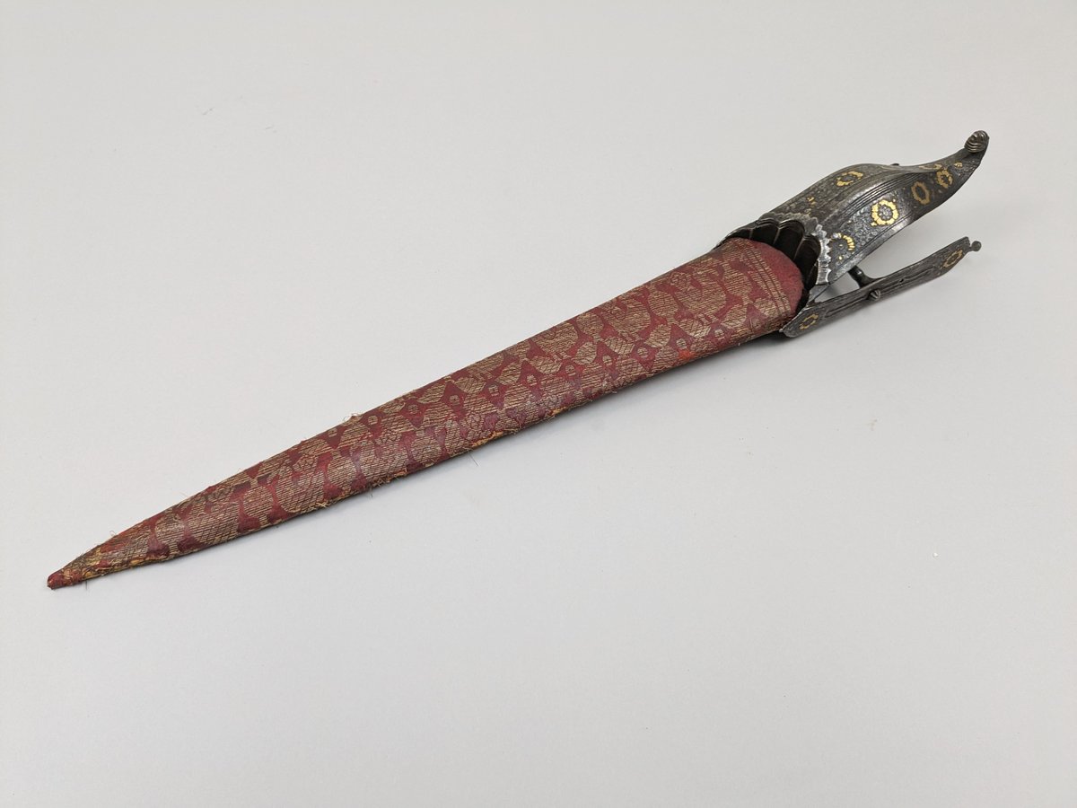 18th C. Indo-Persian Hooded Katar Dagger. Steel with gilt embellishments and fullered triangular blade with upholstered wood scabbard. Missing one cross piece in the handle. Overall length: 23 inches. Blade: 16 inches.