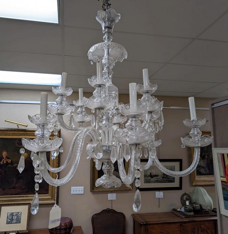 Lot 390: 1940s 12-Light Drop Crystal Chandelier.