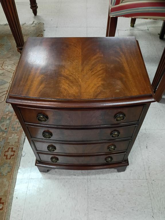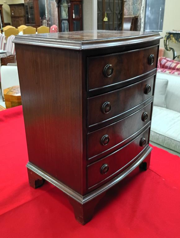 1940s Flame Mahogany 4-drawer diminutive chest with ring pull handles. 17.5" W, 13.25" D, 23.5" H.