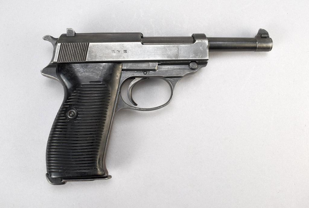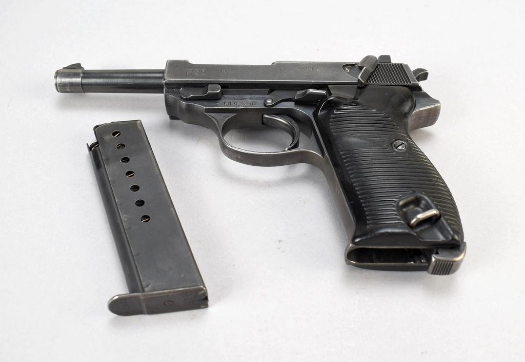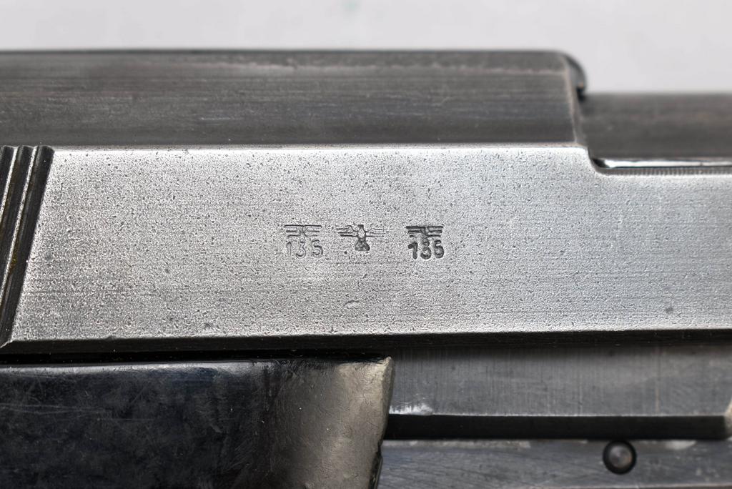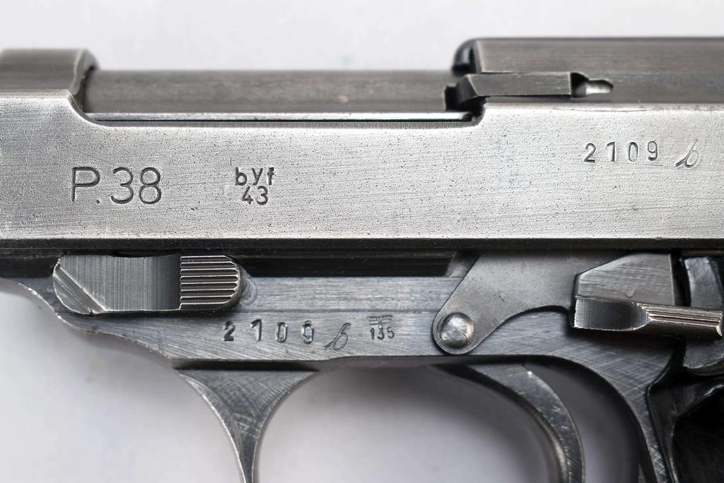 1943 Mauser P38 Standard Issue semiautomatic pistol with magazine. "bfy 43" with eagle over 135 acceptance stamp. No visible importer's mark. Cal: 9mm Para, Serial no. 2109b. 5" barrel, black.