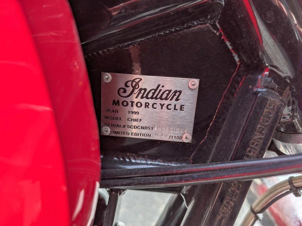 1999 Indian Chief Motorcycle. VIN: 5CDCNB514XG001044, License: 15H7267 (California), Odometer reading: 00005