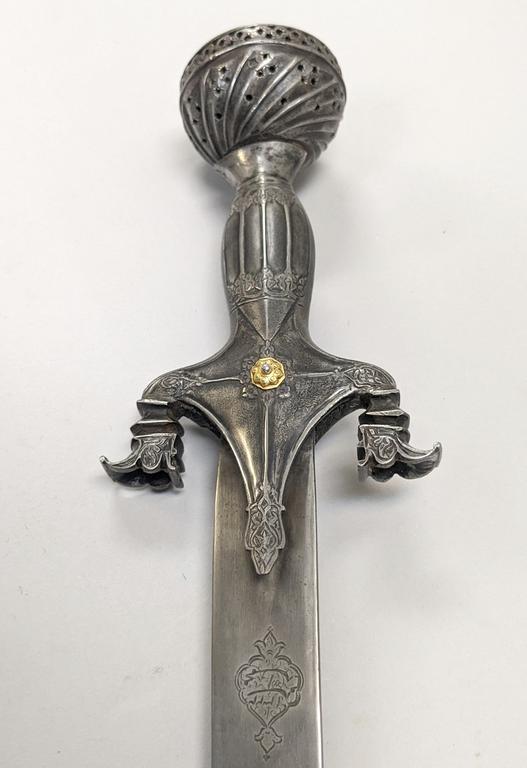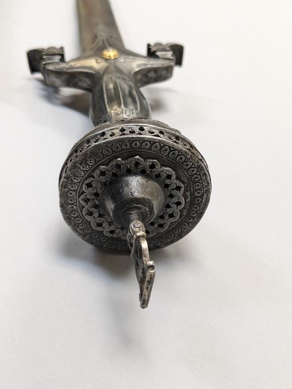 19th C. Afghan Pulwar Sword and Scabbard. Pierced and engraved pommel, handle and downward pointed quillions. Damascus steel blade with engraved cartouche. Wood and leather scabbard with silver locket and chape. Overall sword length: 36 inches. Blade: 28 inches. Scabbard length: 31 inches.
