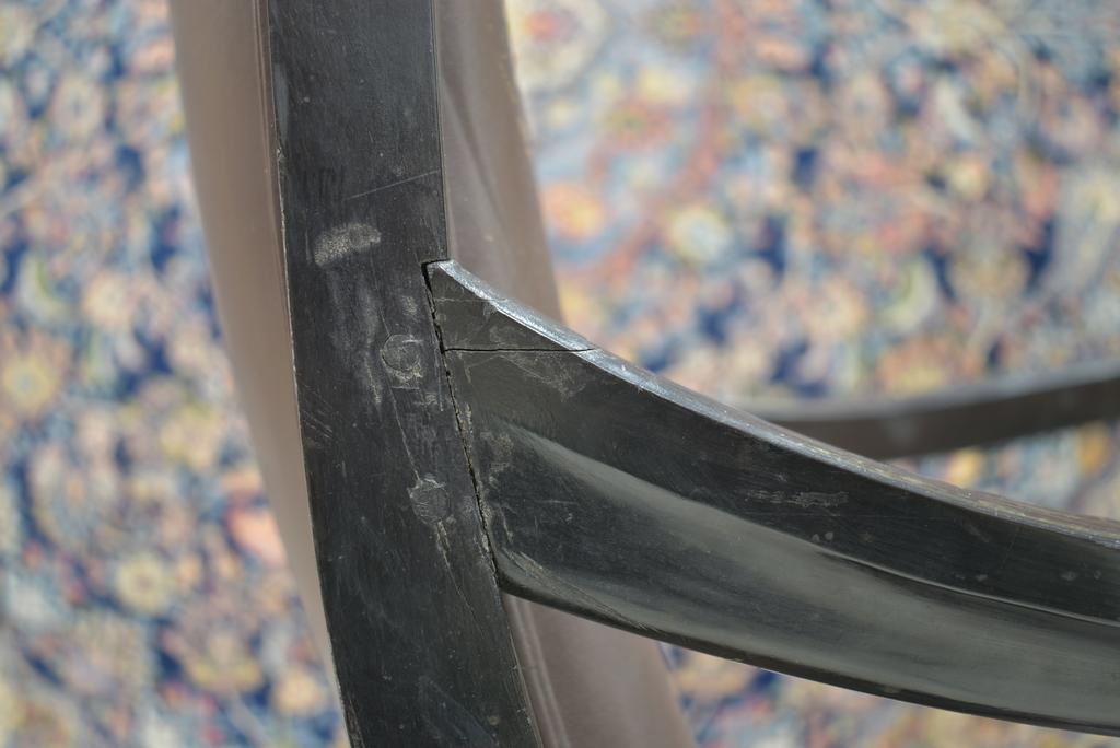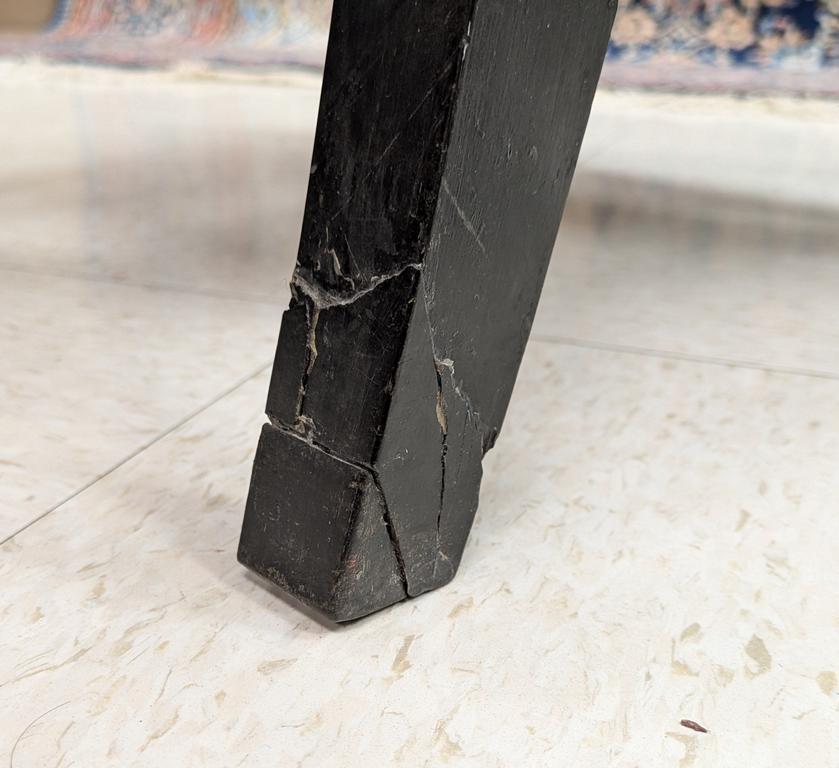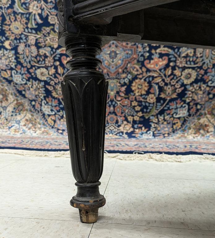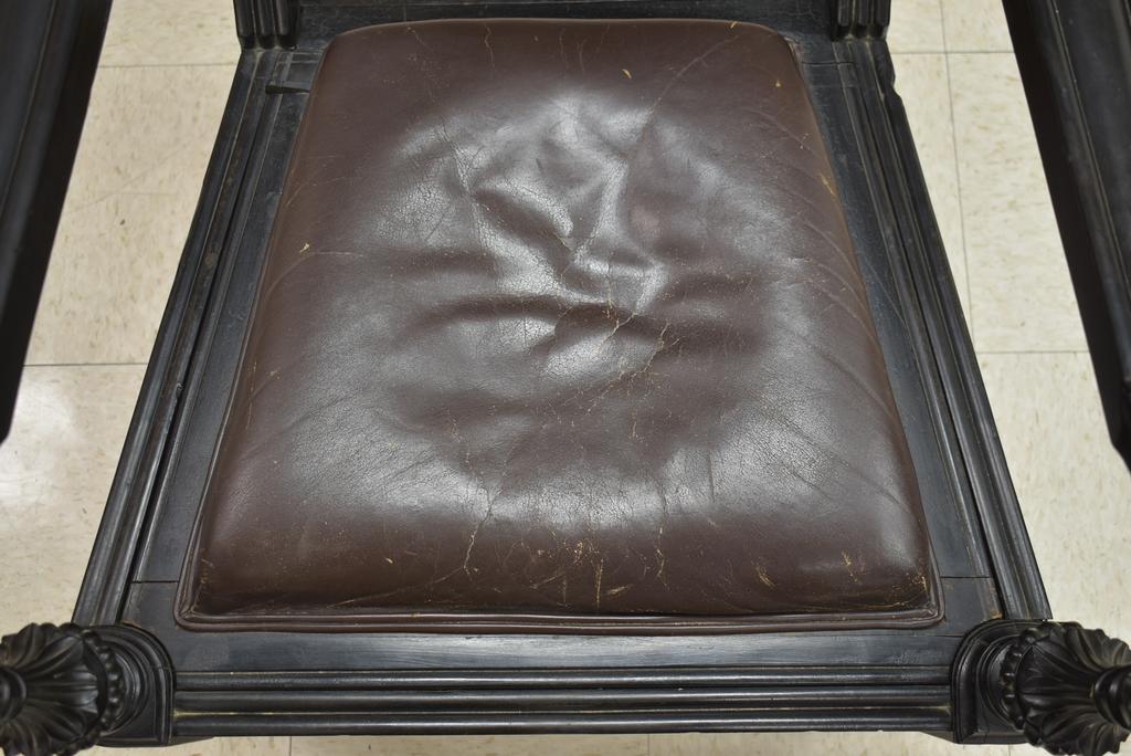 19th C. American ebonized wood armchair. Aesthetic carved wood chair with leather seat and back. 24" W, 30" D, 40" H.