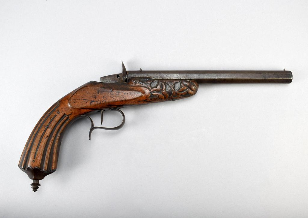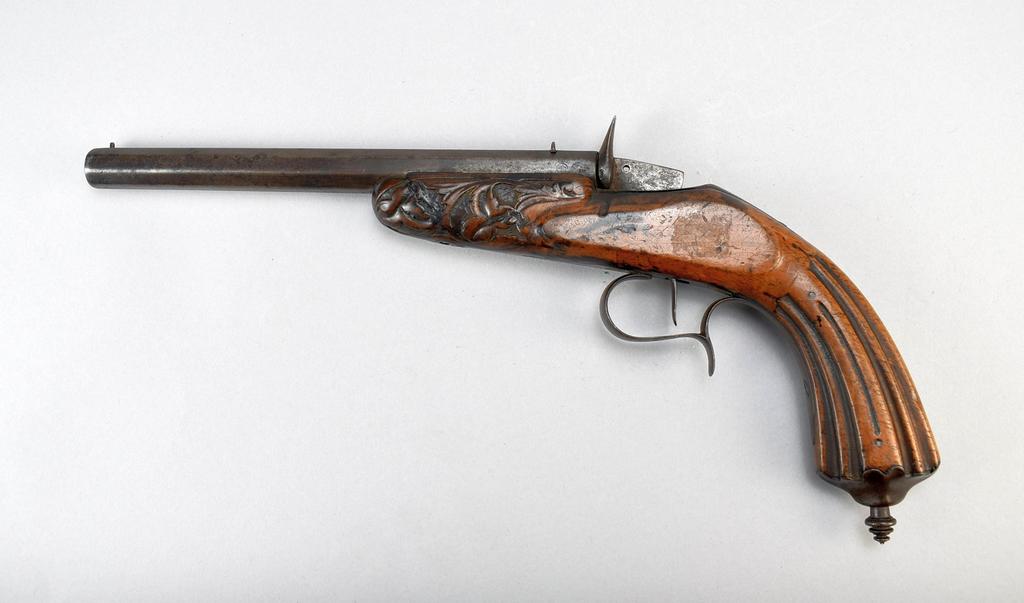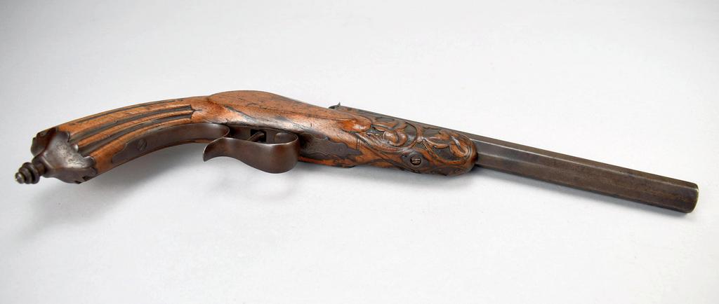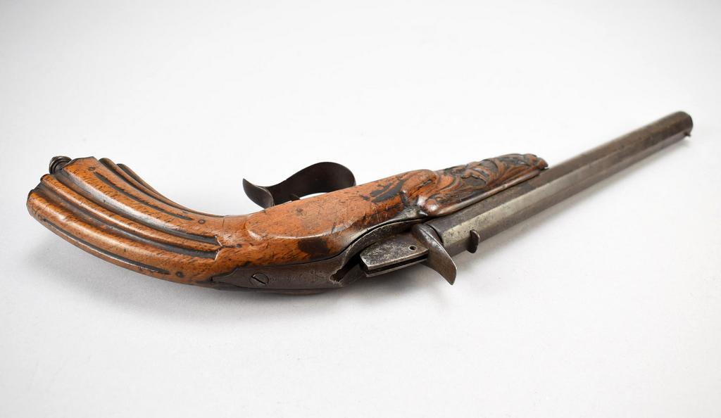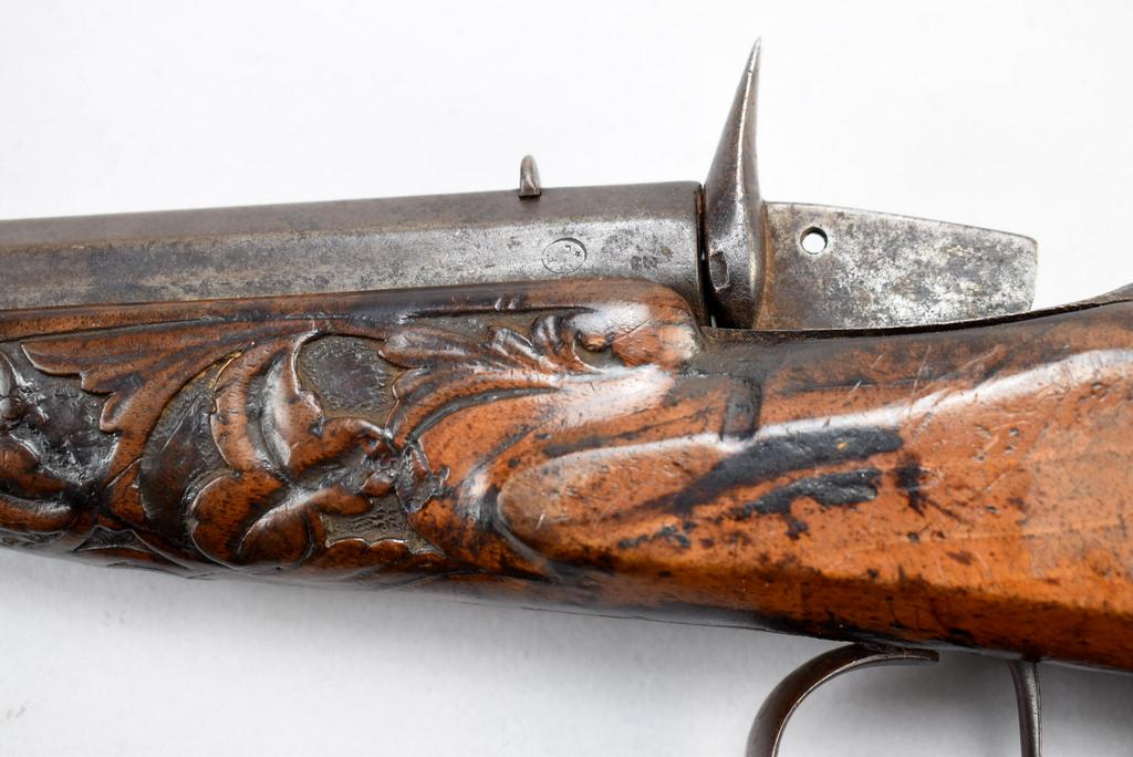 19th Century breech loading pistol. 9 Inch octagonal, smooth 0.35 inch bore barrel. Liege, Belgium proof marked left side barrel near breech. Walnut stock with carved foliage and fluted grip. Steel trigger guard and ornate butt cap.