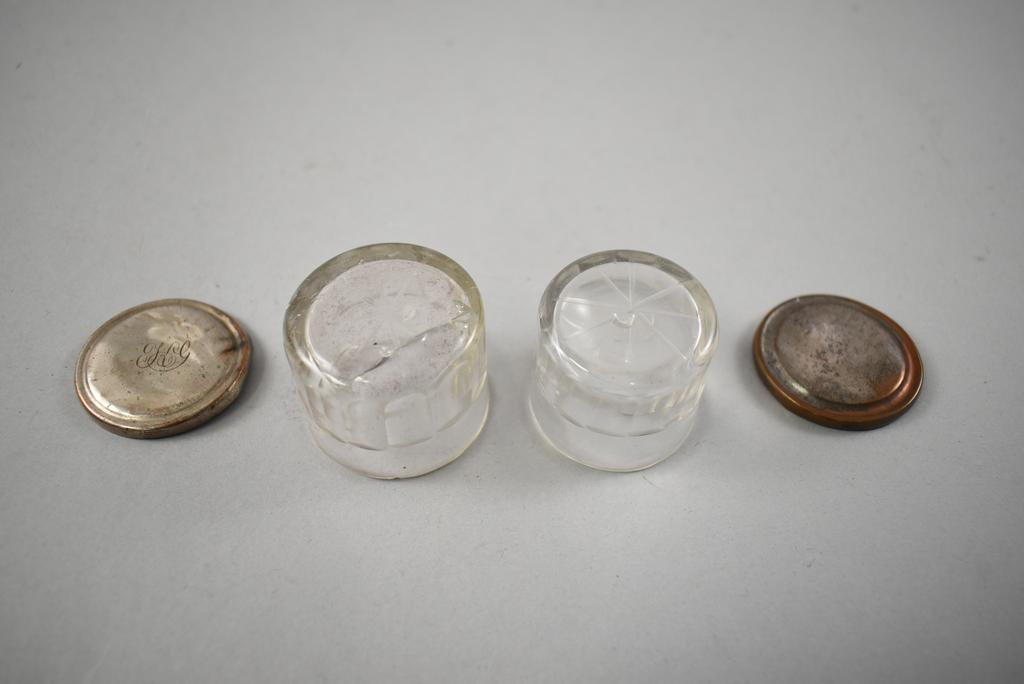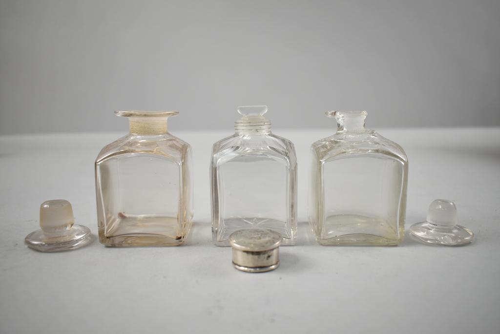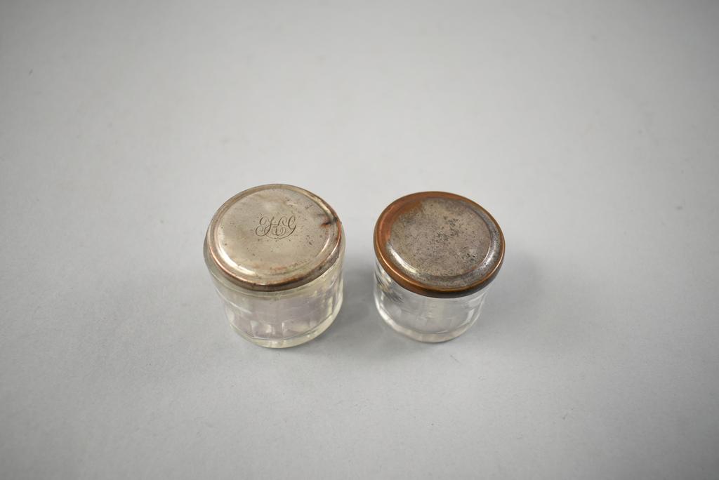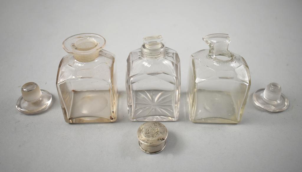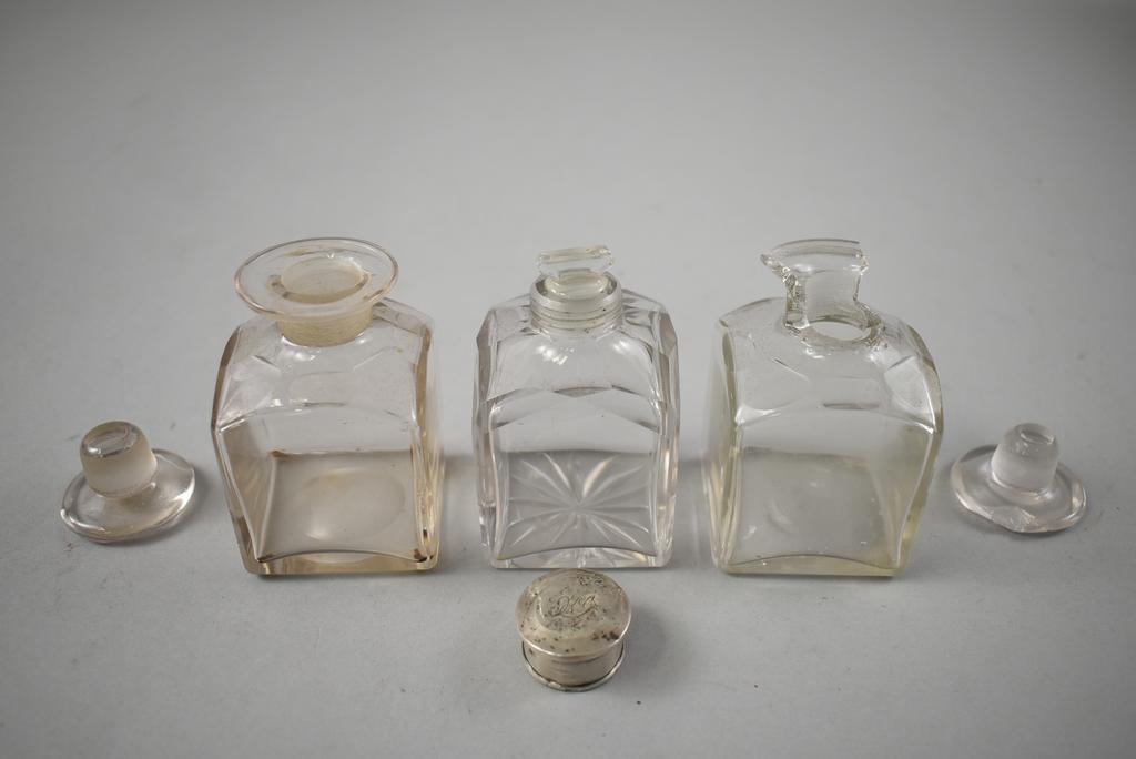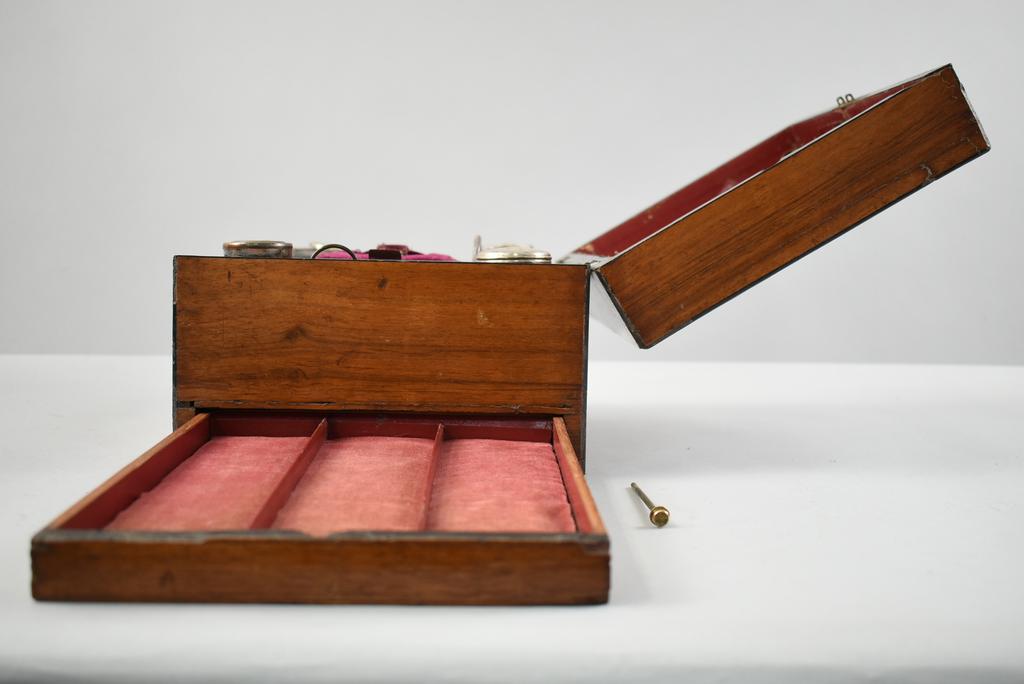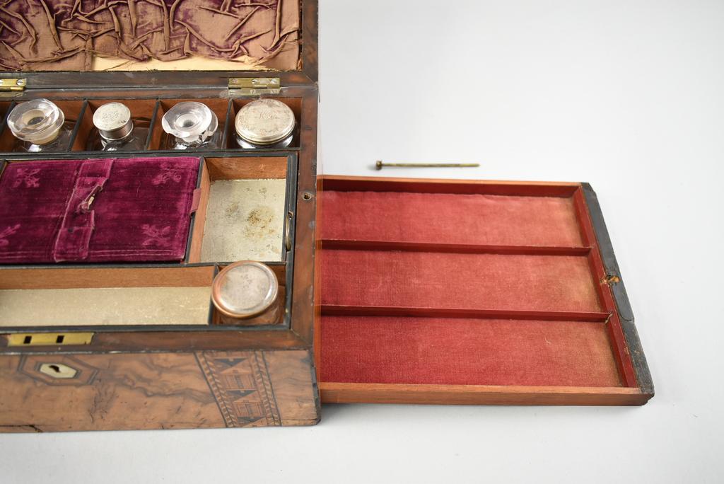 19th C. Vanity box. Rectangular hinge lidded box with burl walnut marquetry inlay top and front. Interior fitted with rectangular silver plate lidded glass boxes, glass jars, central velvet cushion with hidden compartment. Hidden side drawer. 12" x 9" x 7".