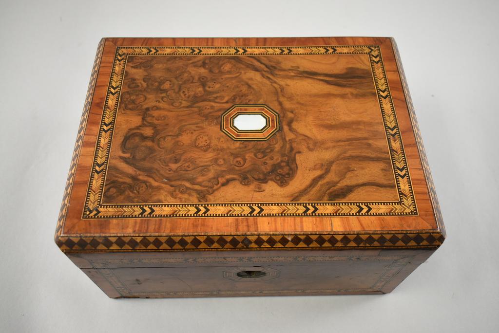 19th C. Burl walnut writing slope. Marquetry inlay with banding and mother-of-pearl medallion. Interior with velvet covered writing slope with compartments beneath. 11 3/4" x 9" x 6".