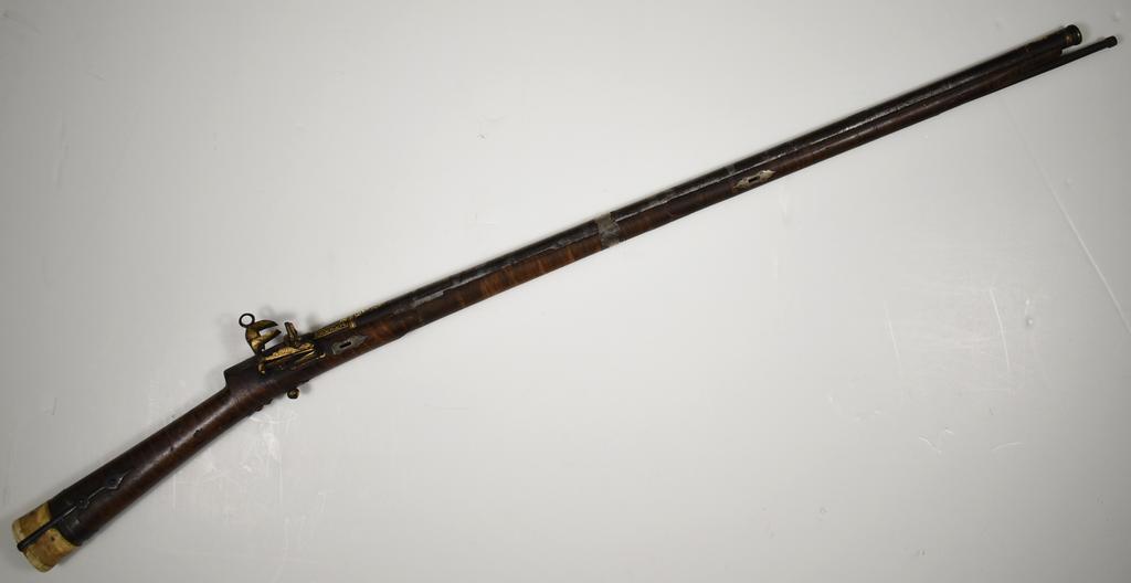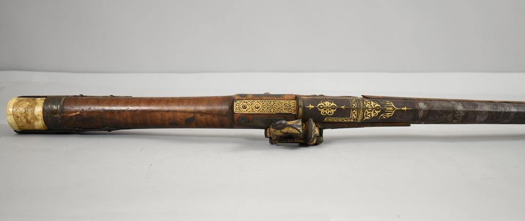 19th C. Caucasian Miquelet-lock Musket. Watered steel, round, grooved bore barrel with gilt kofgari at the breech and muzzle. Approx. 38 inches long and 0.65 inch bore. Additional gilt kofgari on the firing mechanism. Burl walnut stock with steel appointments. Overall length 52 inches.