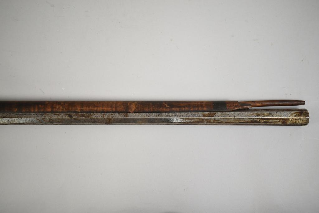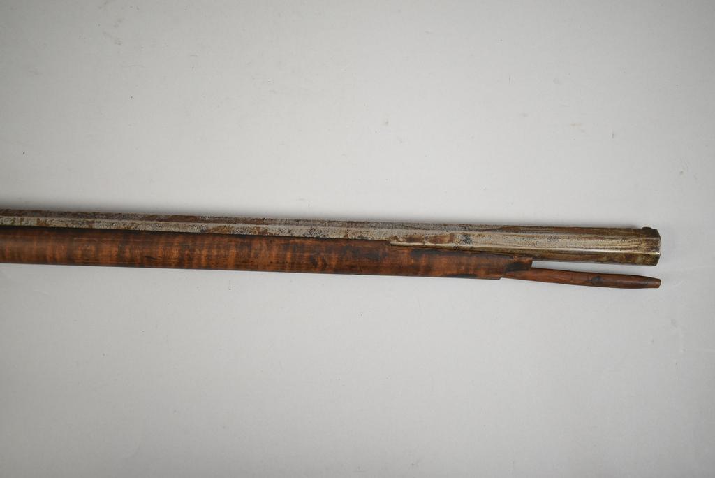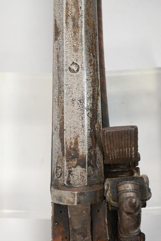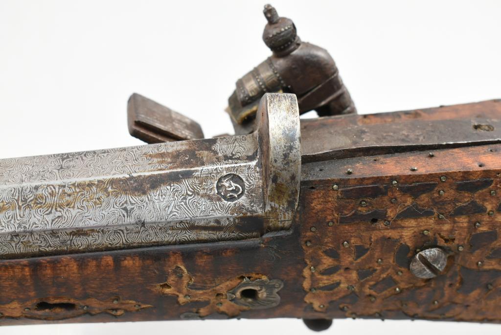 19th C. Caucasian Miquelet-lock Musket. Watered steel, octagonal, grooved, barrel approximately 43.5 inches long and 0.45 inch bore. Tiger walnut stock carved in relief and studded. Overall length 53 inches.