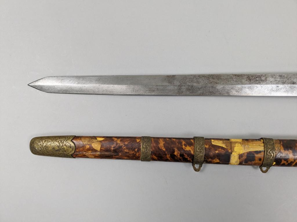 19th C. Chinese Jian Short Sword with Scabbard. Forged steel double edged blade with diamond cross section. Carved wood ribbed handle with engraved brass cross guard and pommel. Wood scabbard with tortoise shell veneer and brass locket, medallions and chape. Overall sword length is 22.5 inches. Blades length is 17 inches.