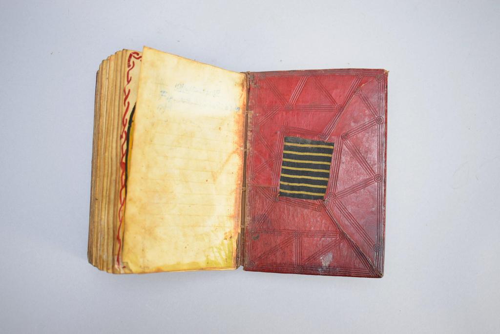 19th C. Ethiopian Coptic miniature Ge'ez Bible. Script in black and red on vellum with illustrations. Leather bound. 80 pages.