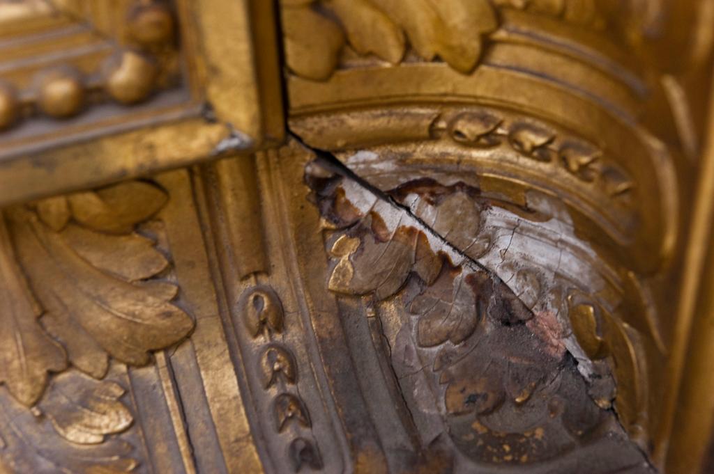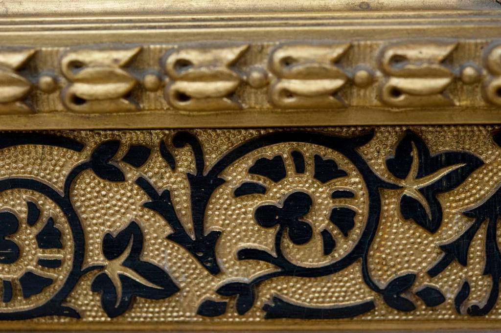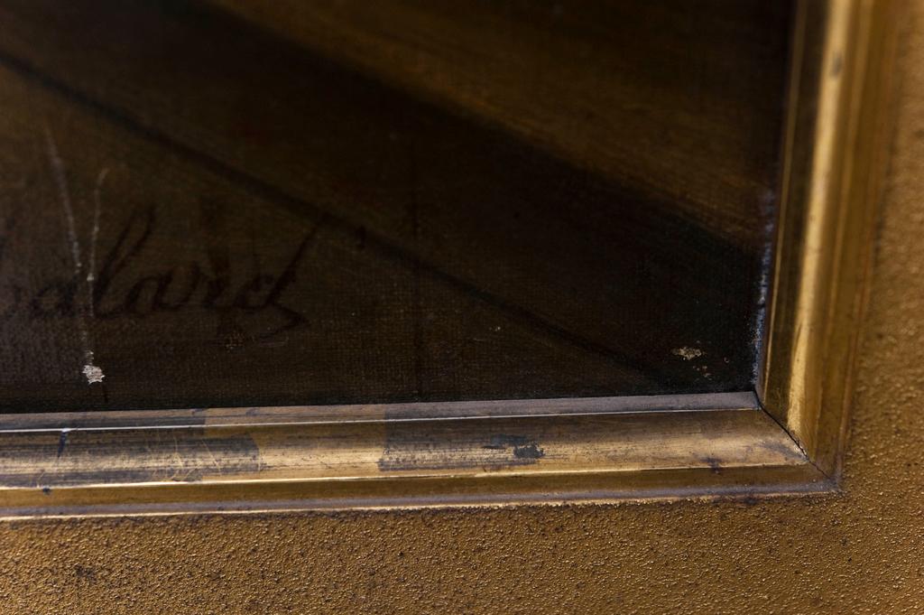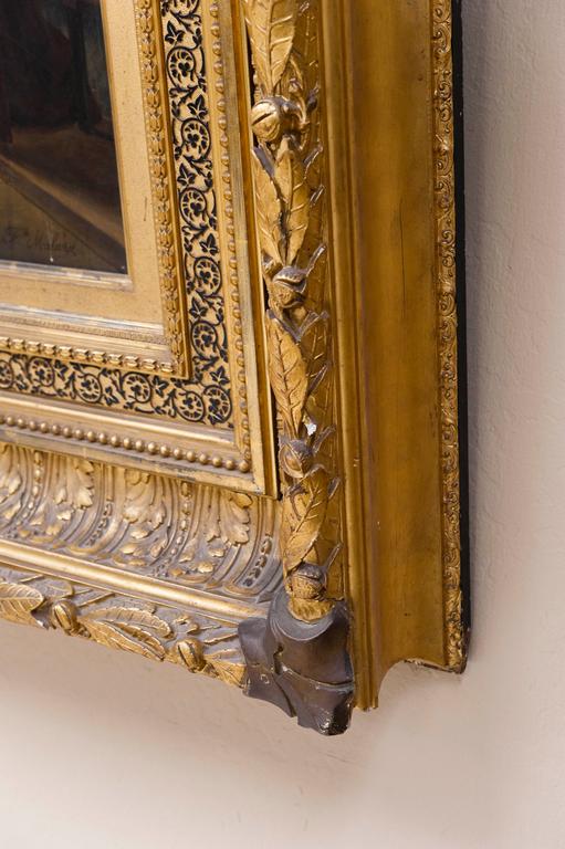 19th C. Large gold leaf frame with painting. Exquisite and ornately molded and decorated framed with painting of the funeral of Friar by Felix Malard. Overall: 67 x 83 inches.