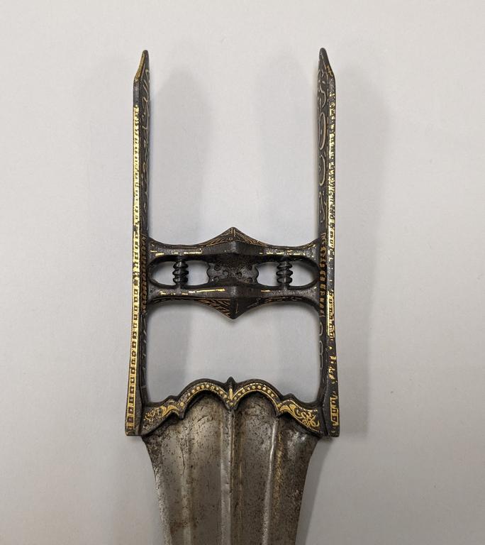 19th C. Indian Katar Push Dagger. Steel with fullered triangular blade and handle adorned with gilt script prayers. Overall length: 14 inches. Blade: 8 inches.