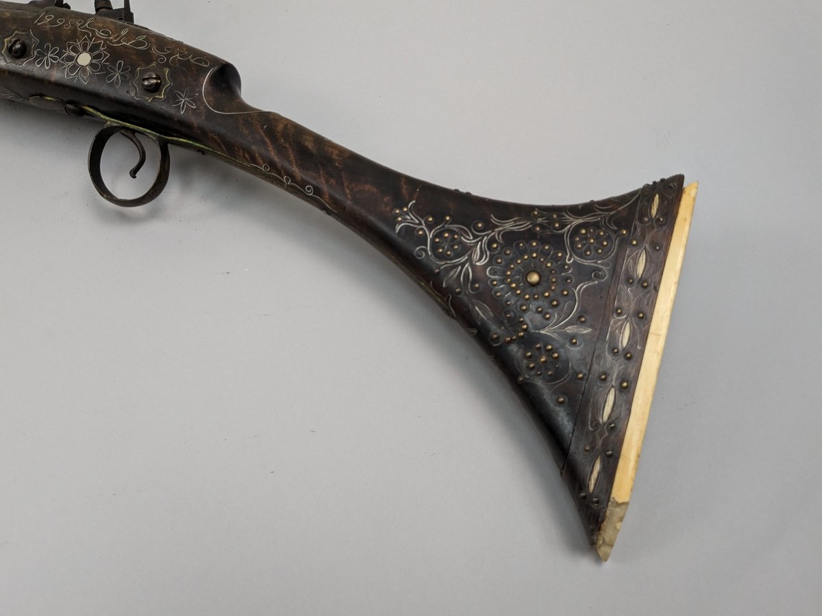 19th C. Indo-Persian Flintlock Rifle. Hardwood stock with inlaid filigree and studs. Hand forged steel barrel has smooth bore, flared muzzle and engraved steel banding. Dimensions: Overall length 60 inches. Barrel length 46.5 inches.