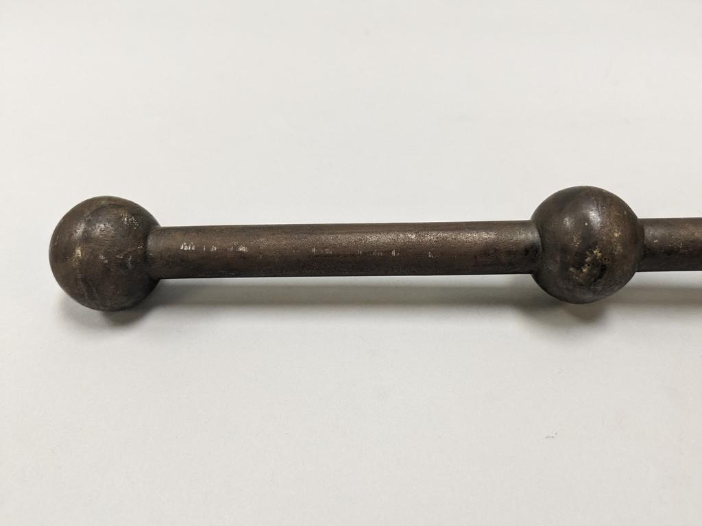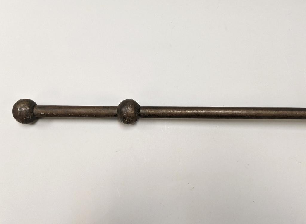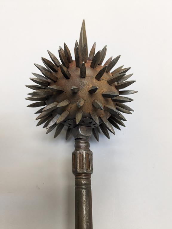 19th C. Indo-Persian Gurz Spiked Mace. Steel oblate spherical head with terminal spike atop. Cylindrical, unadorned steel shaft terminates with two molded orbs. Overall length: 34.5 inches.