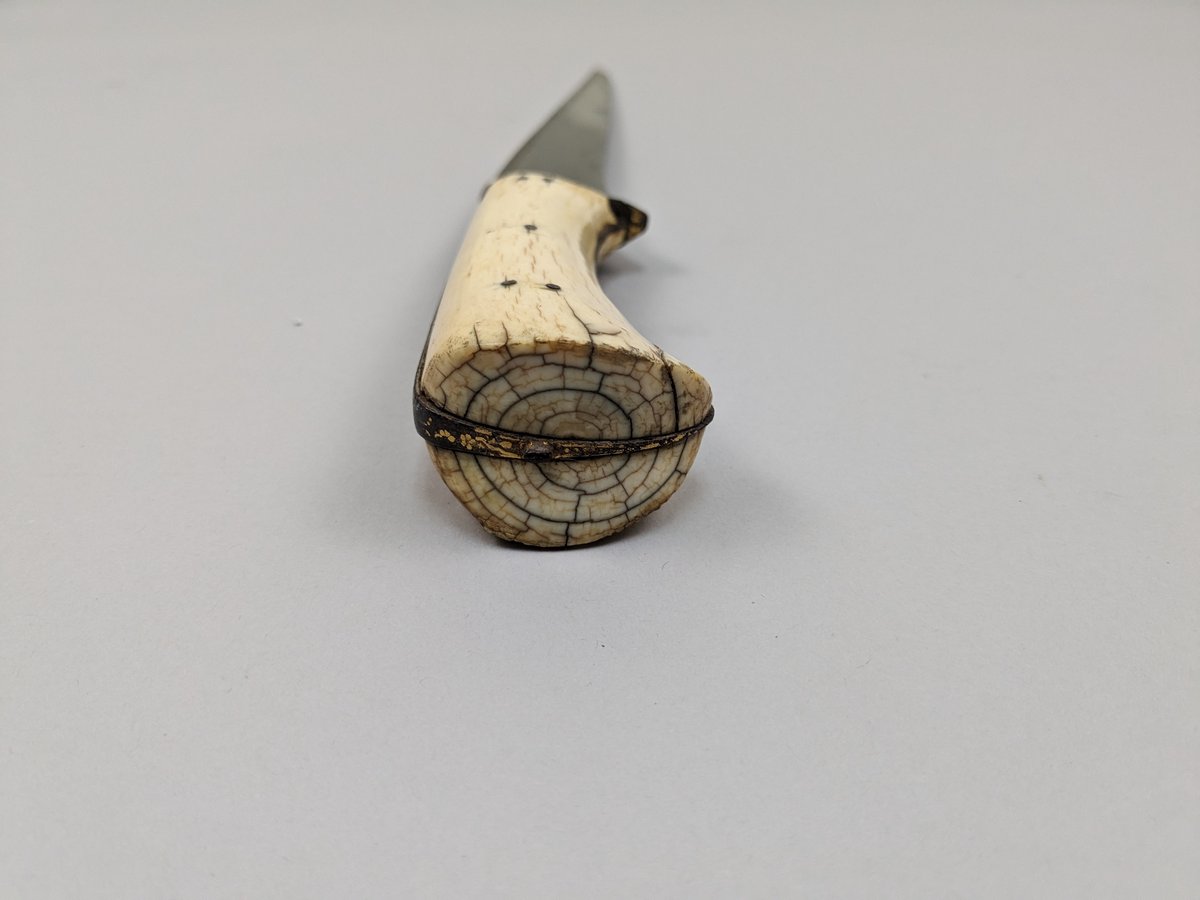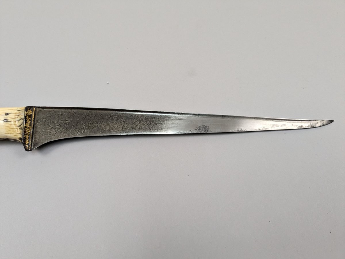 19th C. Indo-Persian Pesh-Kabz. Single edge, watered steel re-curved blade with full tang and "T" shaped spine. Bifurcated bone handle grips on gilt adorned tang. Overall length: 15 inches. Blade: 10.25 inches.