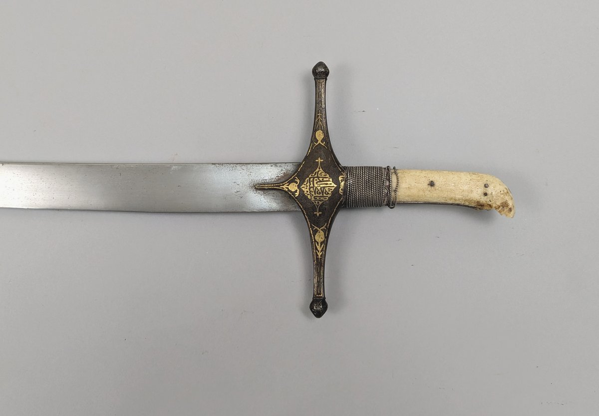 19th C. Indo-Persian Shamshir. Curved watered steel blade with gilded mark. Bifurcated bone handle bound with beaded wire near gilt decorated cross guard and langlets. Damage to grips and one langlet. Blade mark is worn. Dimensions: Overall length 38.5 inches. Blade length 33 inches.