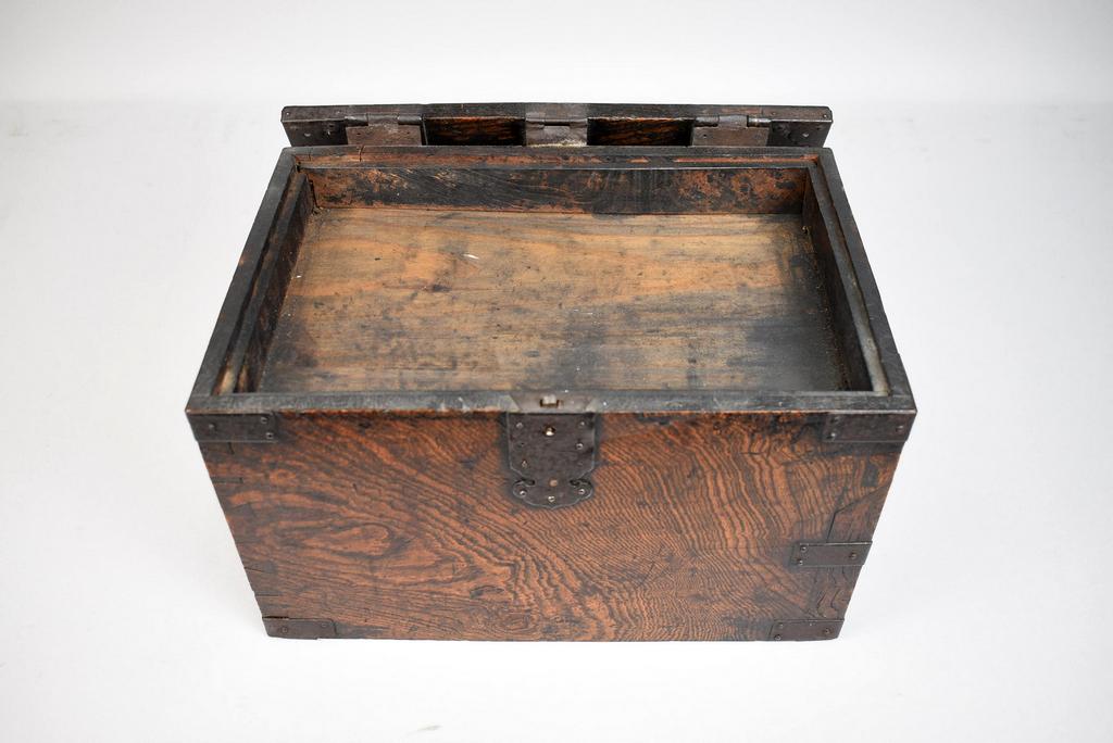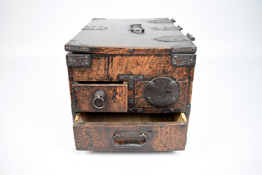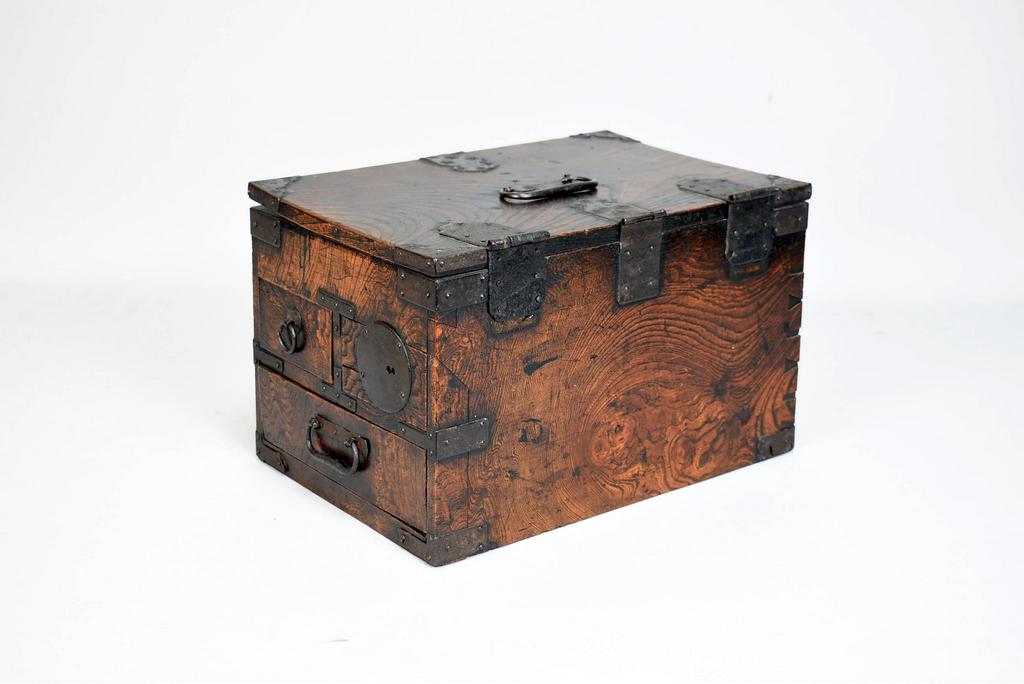 19th C. Japanese calligraphy box (suzuri bako). Keyaki hard wood with forged iron hardware. Hinged top with compartment, 2 side drawers with metal pulls, small side door. Circa 1850. 11 1/8" W, 8 1/4" D, 7 1/2" H.