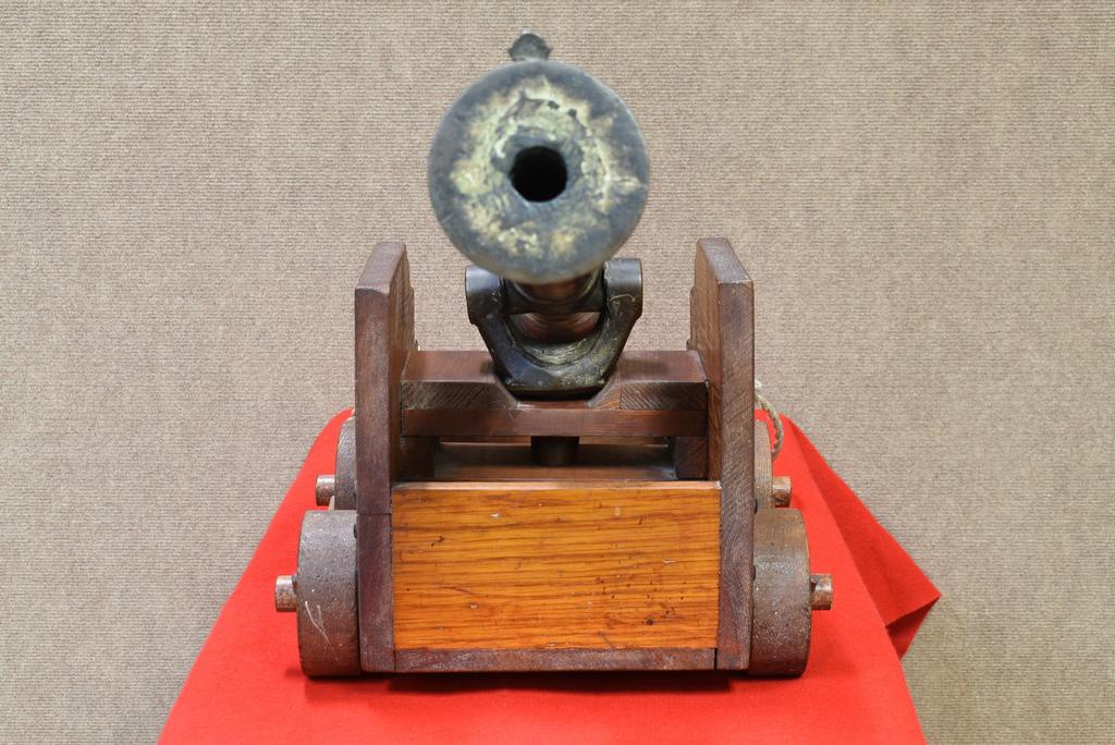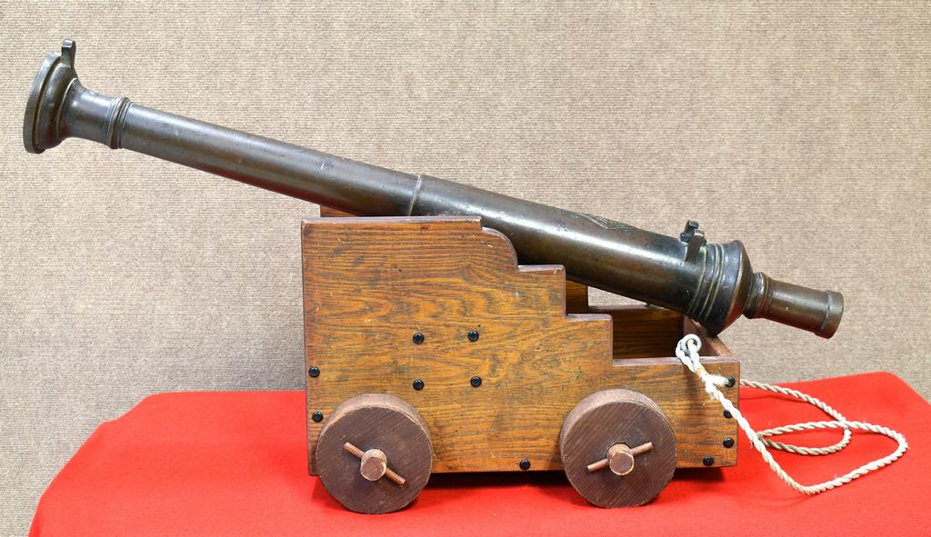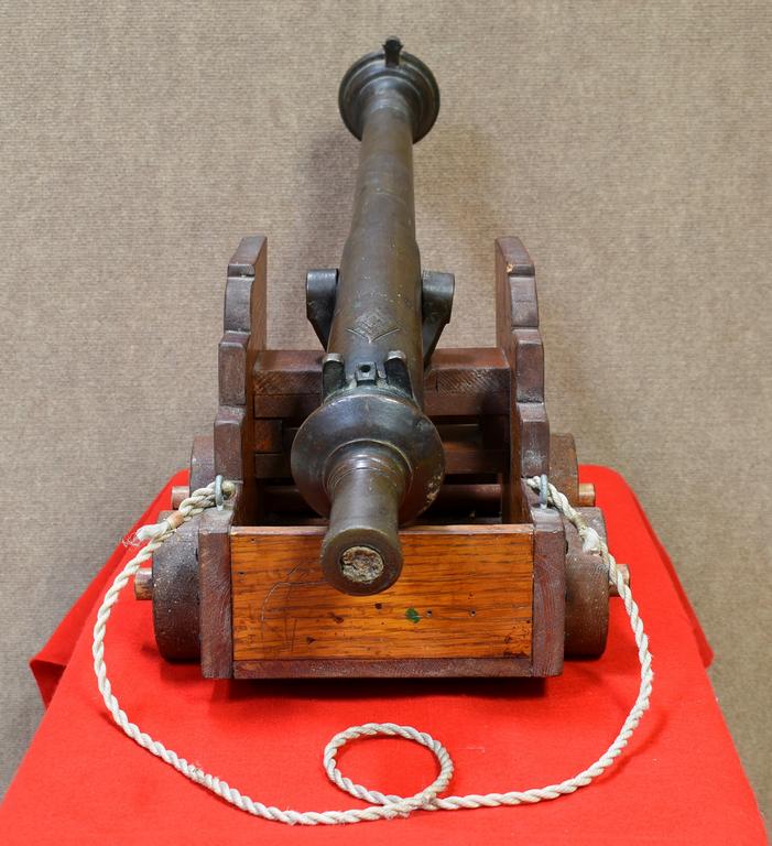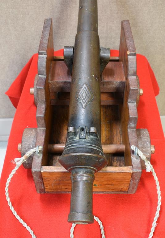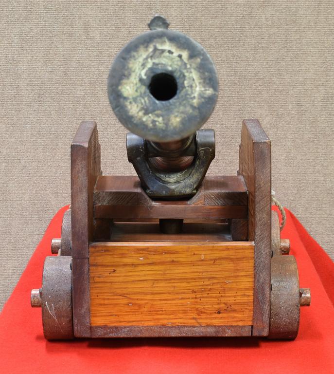 Mid/Late 19th Century bronze ships swivel cannon with wood pull cart. Smooth 1 inch bore. Overall 34 inches long.