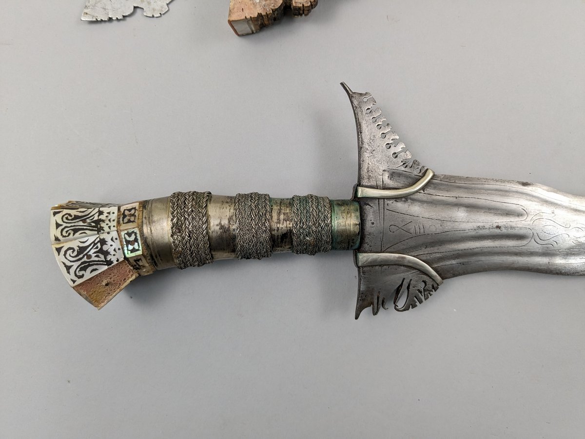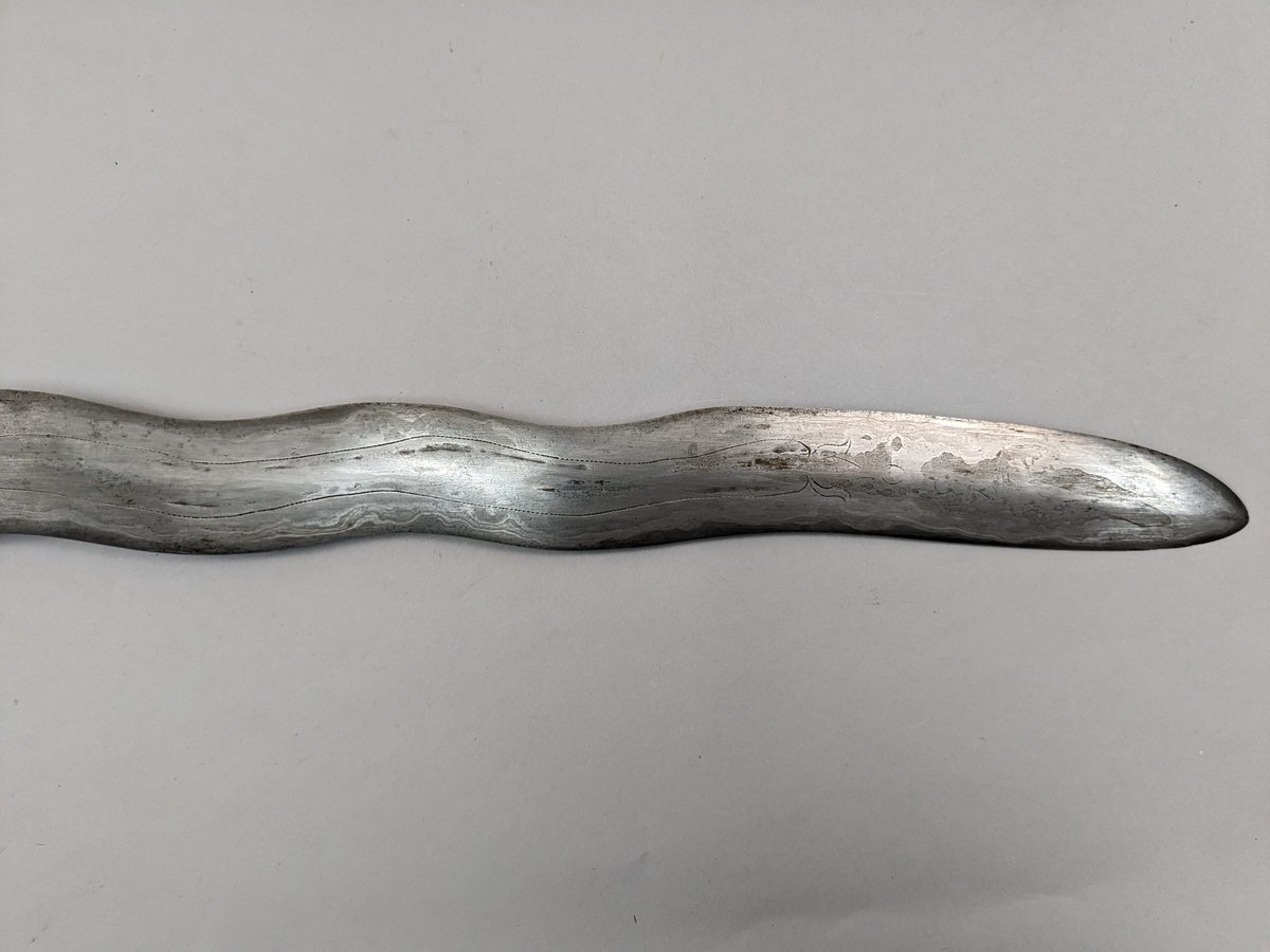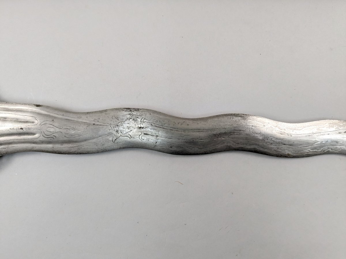 19th C. Moro Kalis Sword. Hand wrought, watered steel, double edge blade with asymmetrical "cockatoo" pierced guard and silver stirrups connecting a hardwood handle. The handle is metal clad with wire work grips and mother of pearl inlaid pommel. Hardwood, rattan bound scabbard with mother of pearl inlaid locket and chape. Overall sword length 28.5 inches. Blade 22 inches.