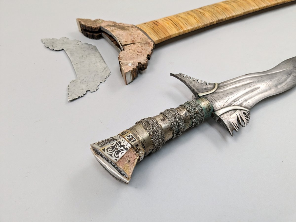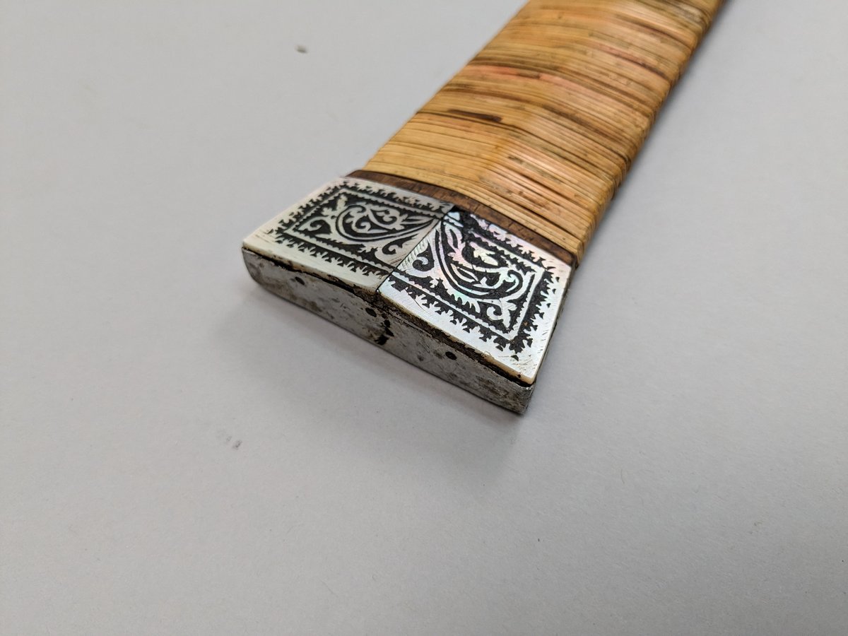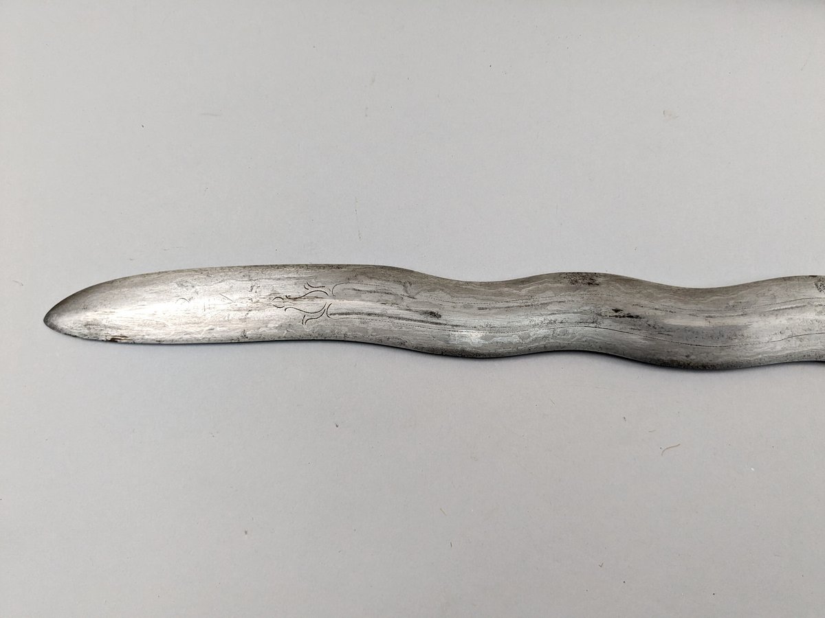 19th C. Moro Kalis Sword. Hand wrought, watered steel, double edge blade with asymmetrical "cockatoo" pierced guard and silver stirrups connecting a hardwood handle. The handle is metal clad with wire work grips and mother of pearl inlaid pommel. Hardwood, rattan bound scabbard with mother of pearl inlaid locket and chape. Overall sword length 28.5 inches. Blade 22 inches.