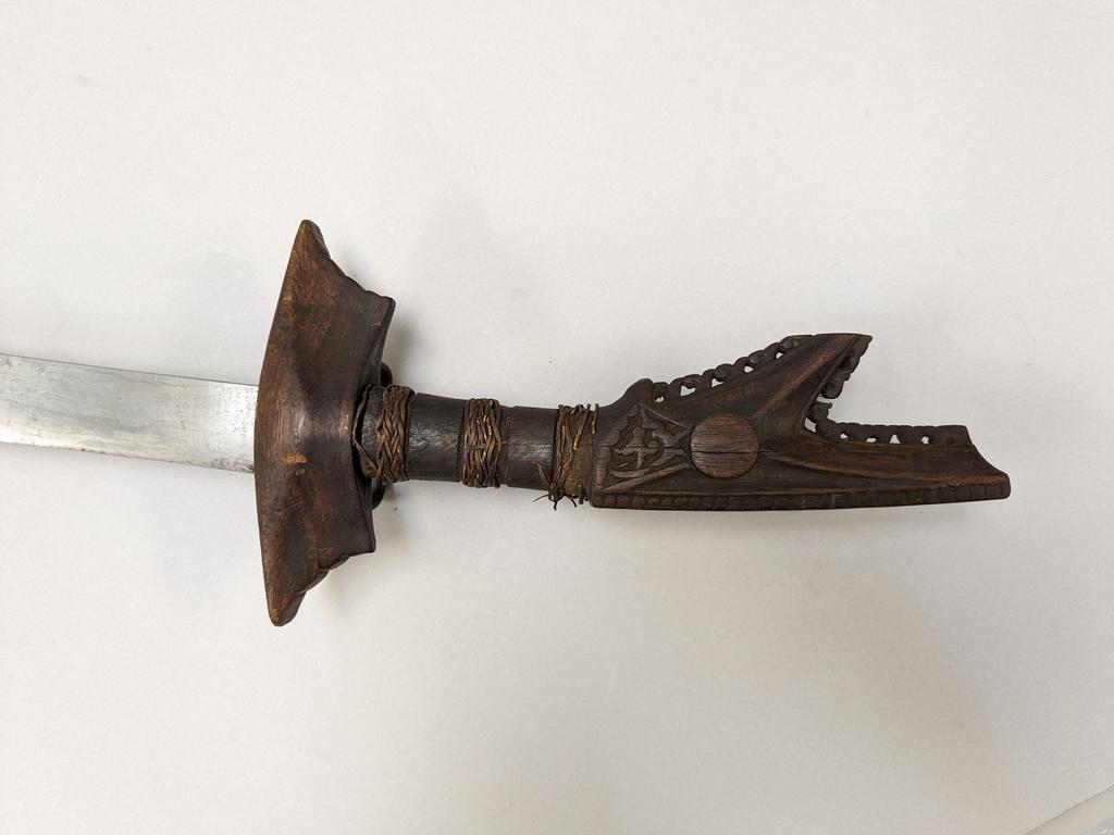 19th C. Moro Kampilan Sword. Cruciform, carved hardwood hilt with open maw pommel and woven bands. Broad, hand wrought blade with profiled tip. Overall length 38 inches. Blade 27.5 inches.