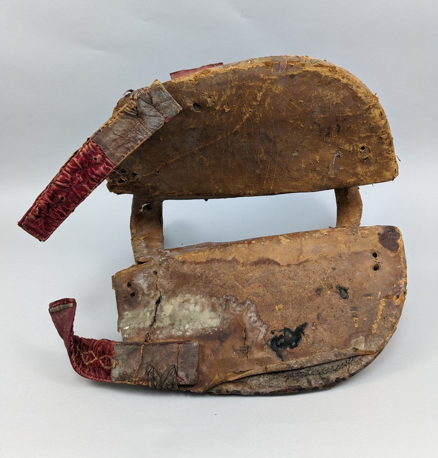 19th C. Moroccan Saddle. Leather and wood. Dimensions 20 in. long x 20 in. wide x 17 tall.
