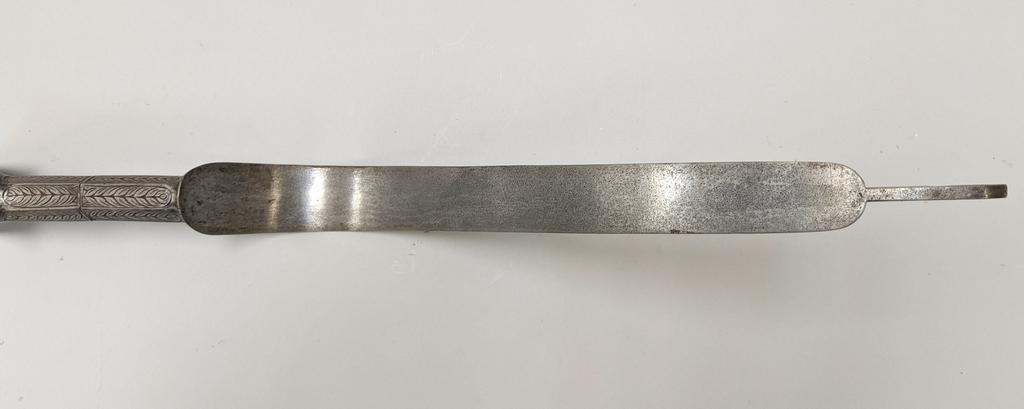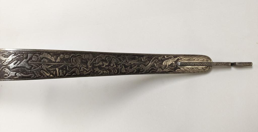 19th C. Mughal Bow and Arrows. Reverse curve steel bow is engraved with hunters, predators and prey. Approximately 30 reed arrows with steel and iron points carved wood and bone nocks. Overall bow length: 33 1/2 inches, Approximate arrow length: 28 inches.