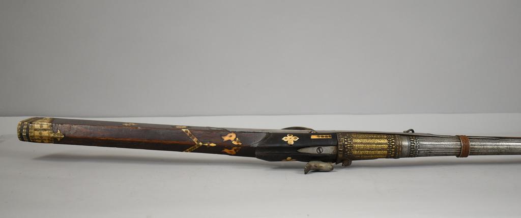 19th C. Mughal Toradar Percussion Musket. Round smooth bore barrel; engraved at breech and muzzle with gilt adornment and wire beadwork along the length. Approx. 51 inches long and 0.65 inch bore. Traditional form inlaid hardwood stock. Overall length 70.5 inches.