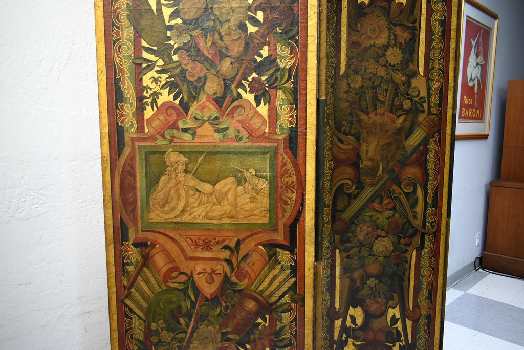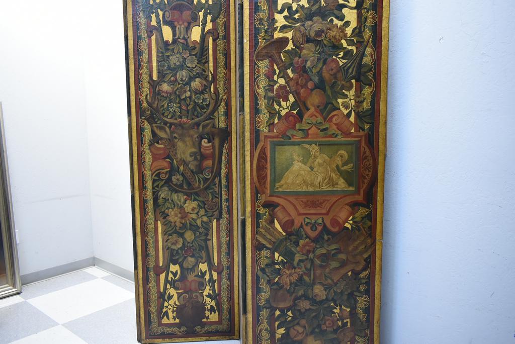 19th C. Neoclassical style folding 4-panel screen. Oil on canvas, each panel painted. Stag, Boar, trophies and deities in reserves among foliate background. 90" tall, each panel: 24" wide.
