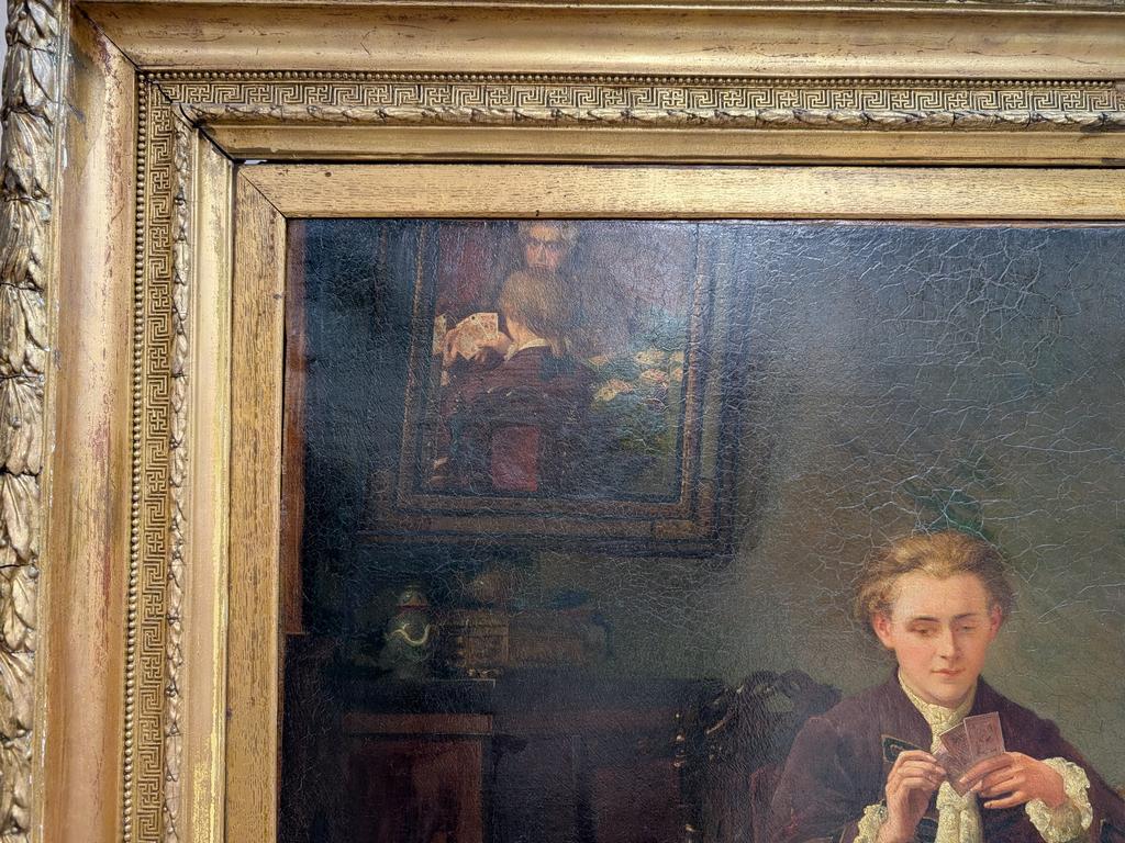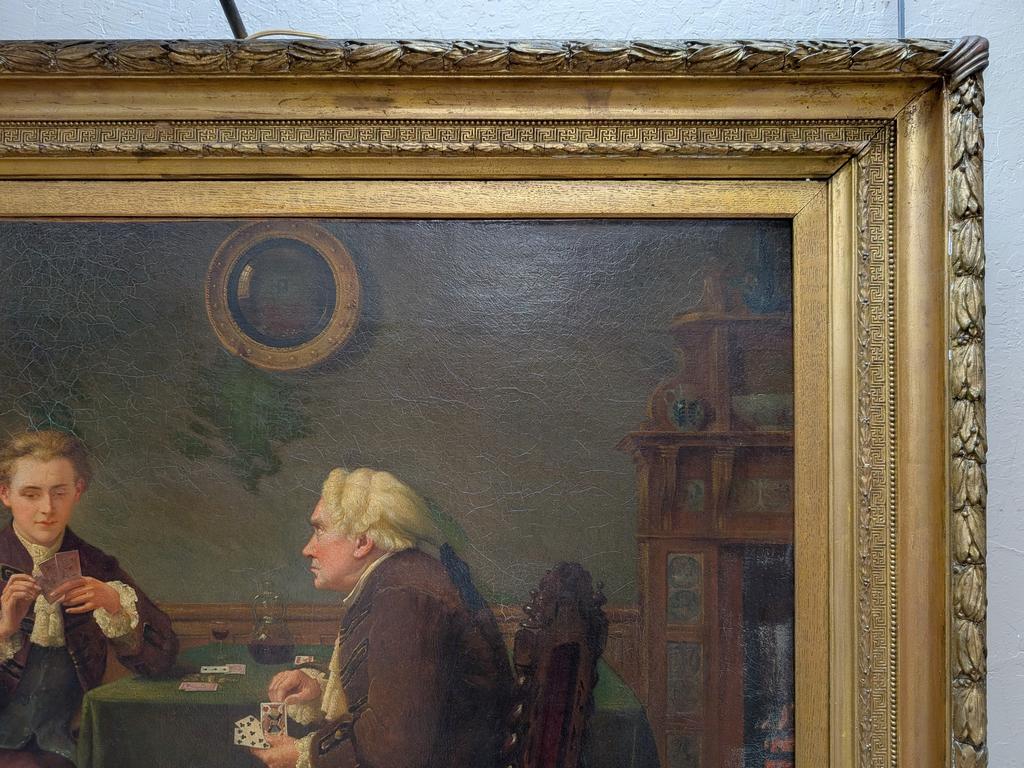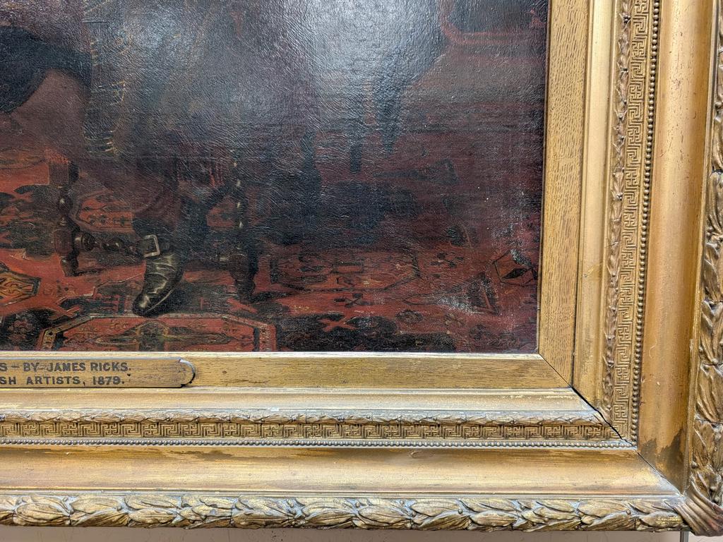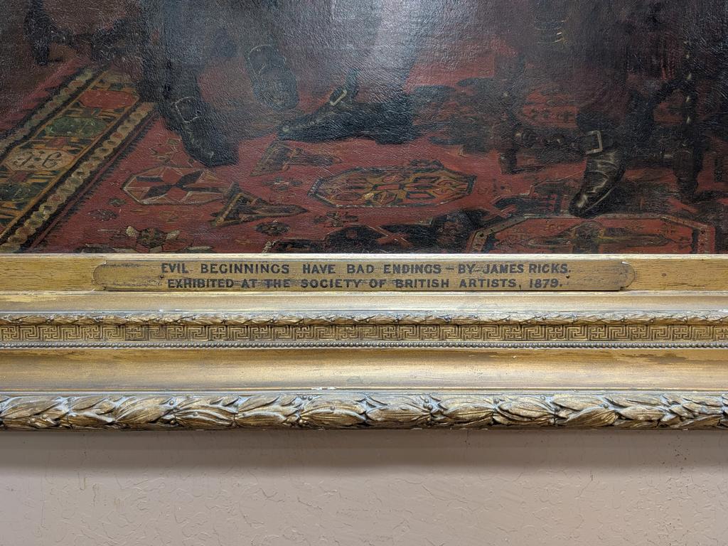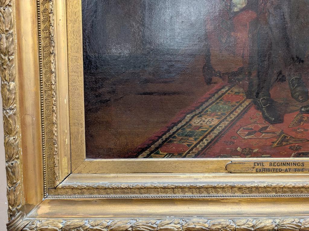 19th C. Oil on canvas, attributed to James Ricks, Evil Beginnings have Bad Endings. Attached plaque with title, artist name & "Exhibited at the Society of British Artists 1879". No signature noted. 38" x 46". Ornate gilt framed. Overall: 48" x 62".