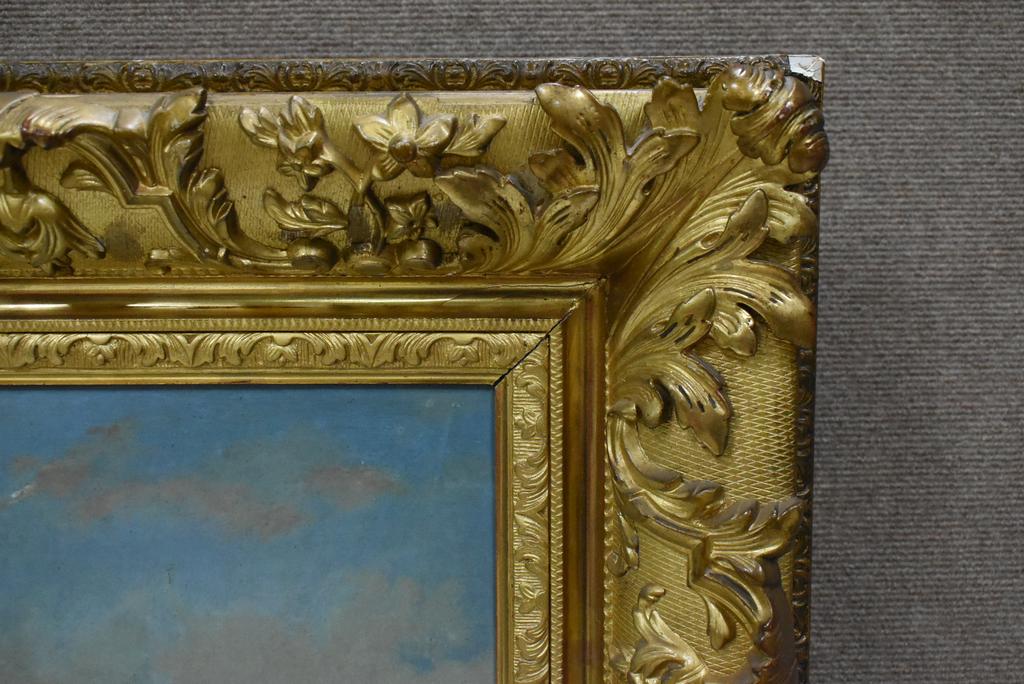 19th C. Oil on canvas, Country landscape with women on horses crossing the stream and people on the path. No discernible signature. 18" x 24". Gilt framed. Overall: 28 1/2" x 34 1/4".