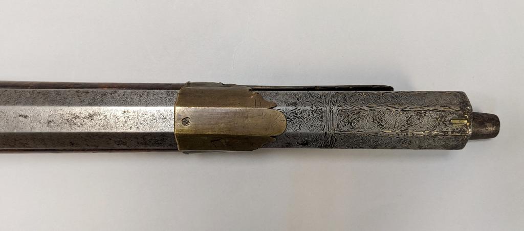 19th C. Ottoman Miquelet Flintlock Castle Rifle. Massive flintlock rifle with inlaid hardwood stock and brass banding. Watered steel octagonal rifled barrel is engraved with gilt adornments. Engraved and gilded lock plate and hammer assembly as well as peaked rear sight. Approximately 0.75 cal. Overall length 60 inches. Barrel length 42.5 inches.