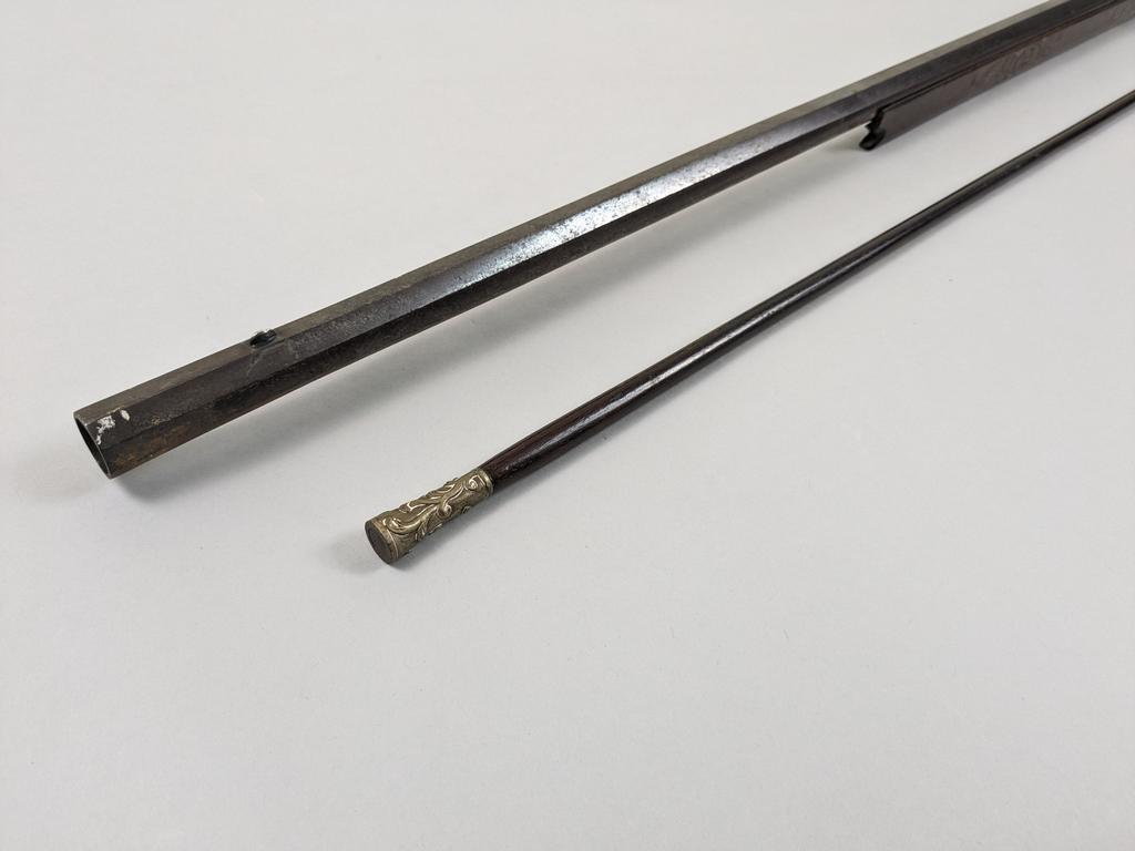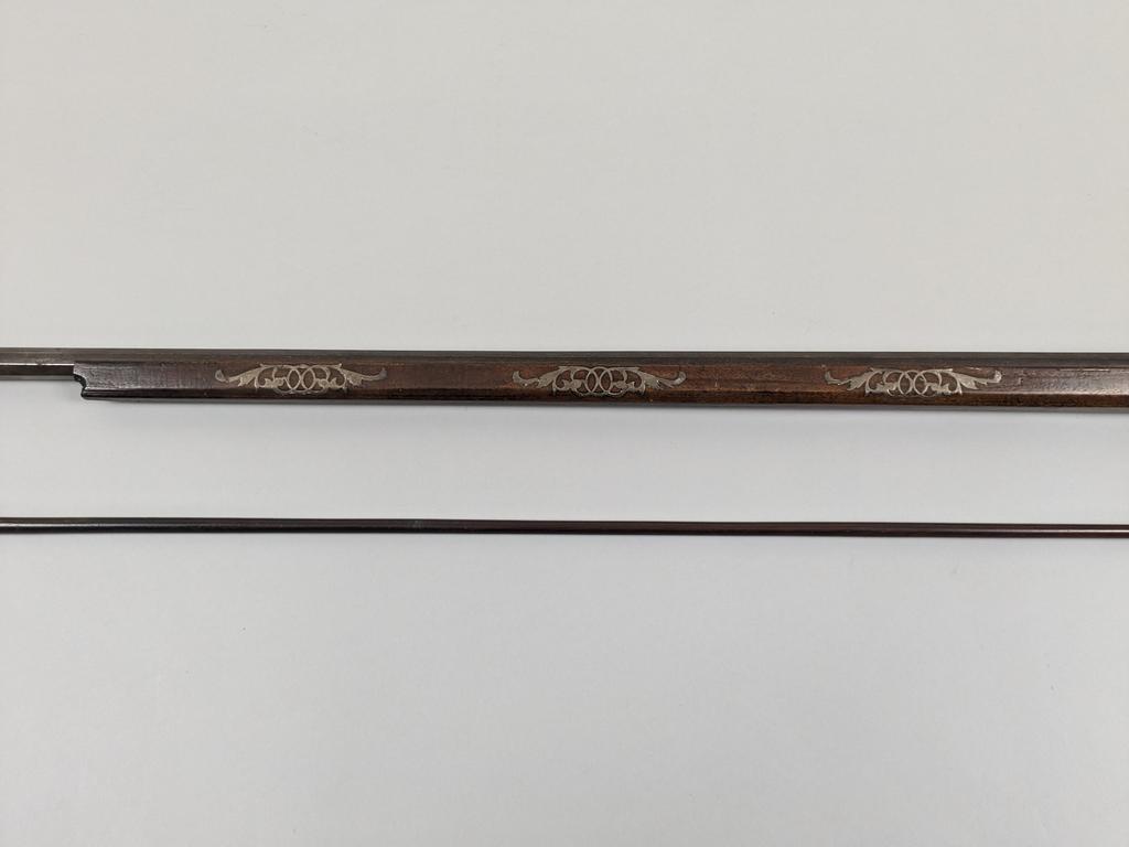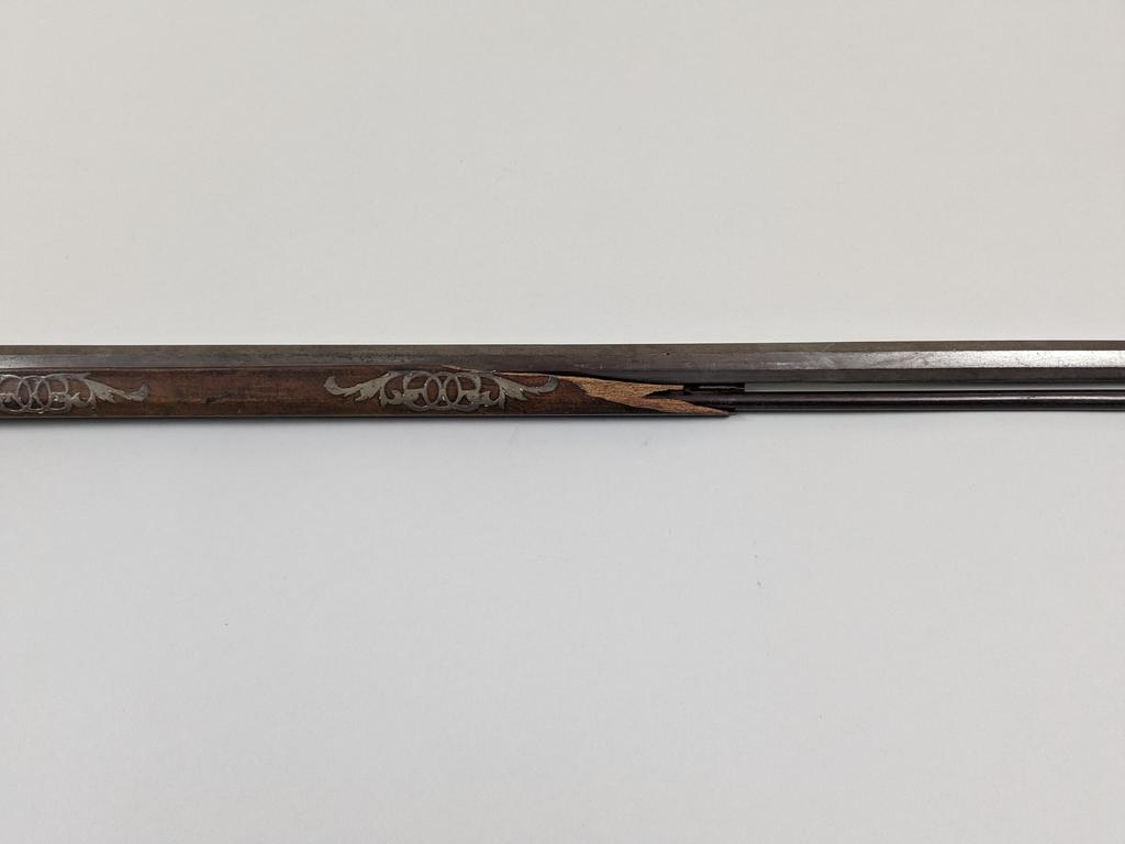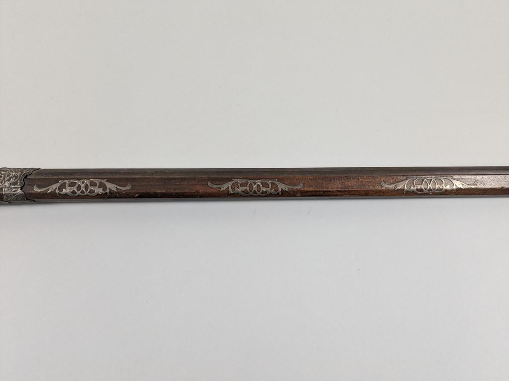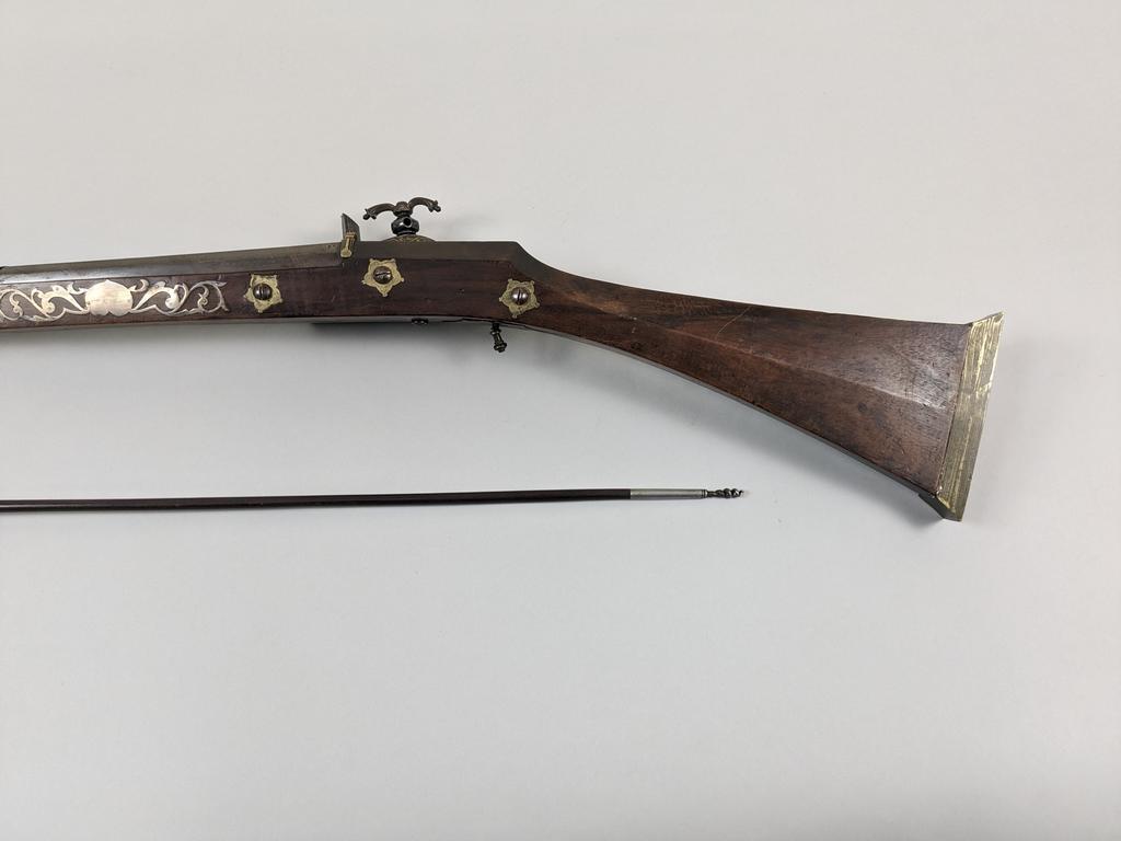 19th C. Ottoman Miquelet Flintlock Rifle. Hardwood flat cut stock inlaid with silver scroll work and brass stars. Heavily engraved mechanism with gilt. Octagonal 58 inch steel barrel with armorer stamps adorned with gold leaf, 0.65 inch diameter. Ramrod with embossed brass nob.