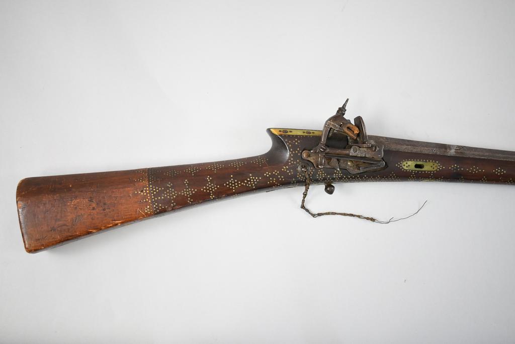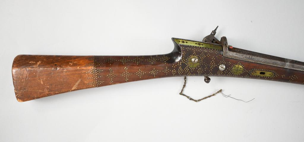 19th C. Ottoman miquelet rifle. 35.5 inch octagonal barrel. Overall with gilt metal dotted and green painted bone inlay. Two piece stock with pentagonal butt. Overall: 49 3/4" long.