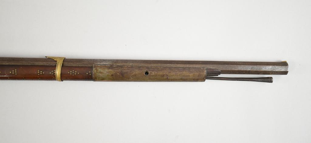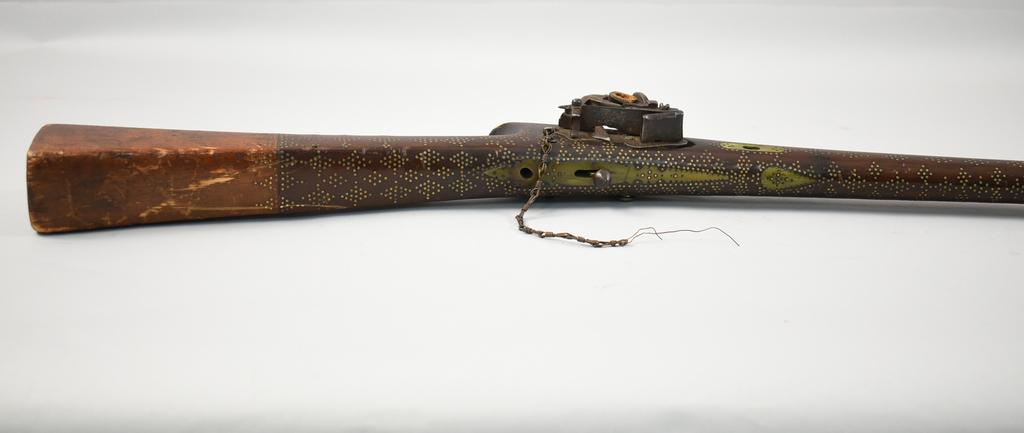 19th C. Ottoman miquelet rifle. 35.5 inch octagonal barrel. Overall with gilt metal dotted and green painted bone inlay. Two piece stock with pentagonal butt. Overall: 49 3/4" long.