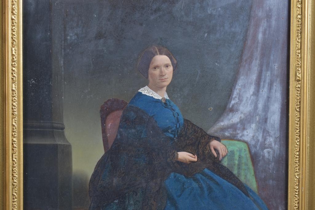 19th C. Painting on board, profile of a seated noblewoman. Gilt framed. Sight: 20" x 16". Overall: 26.5" x 22".